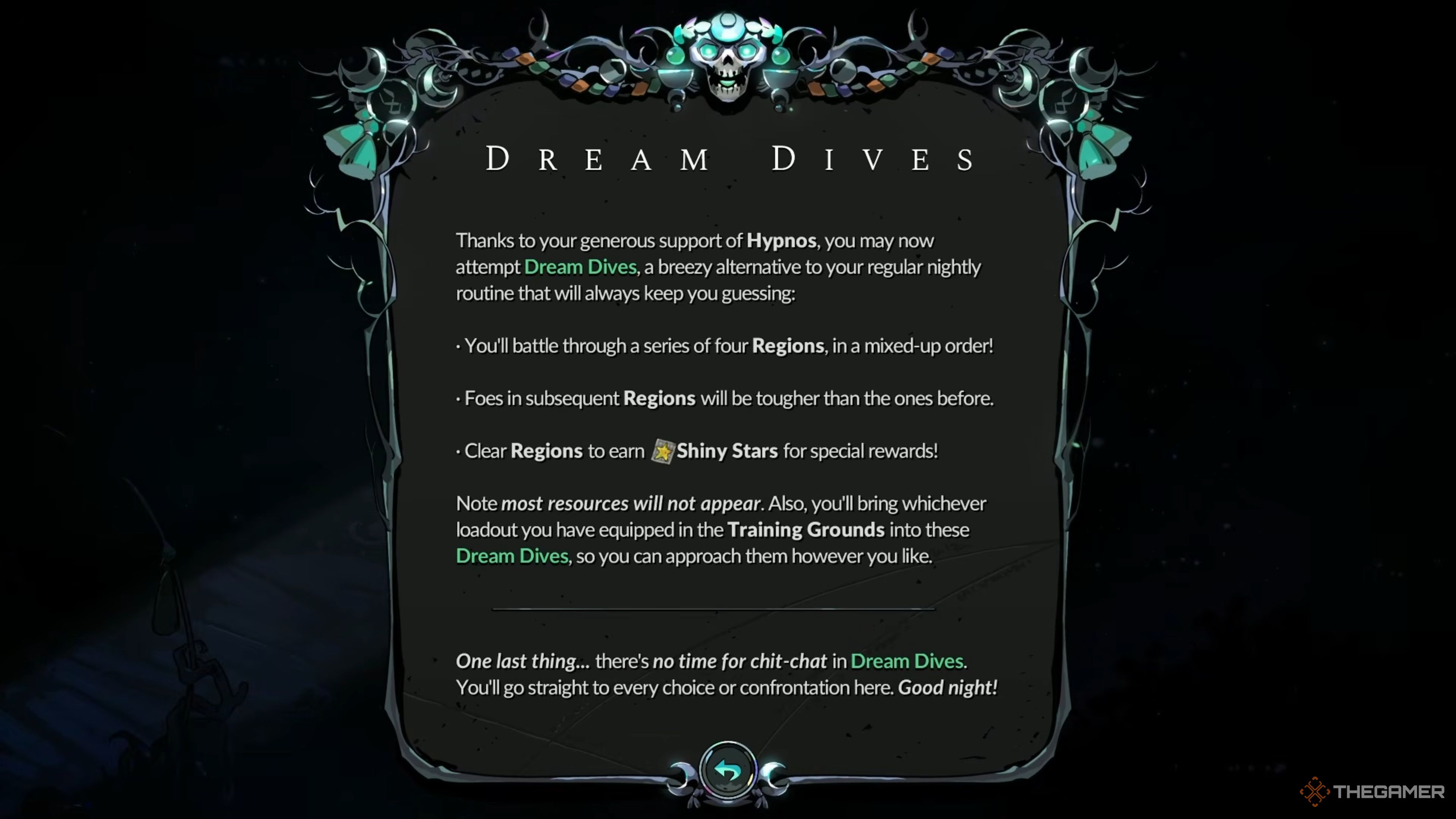 Начните своё Погружение в Сон, поговорив с Гипносом. Завершение Погружения в Сон — которое генерируется случайным образом каждый раз — даст вам Блестящие Звёзды. Затем вы сможете обменять эти звёзды на специальные награды! Будьте осторожны, хотя: этот режим сложный, поэтому убедитесь, что вы готовы к испытанию!
