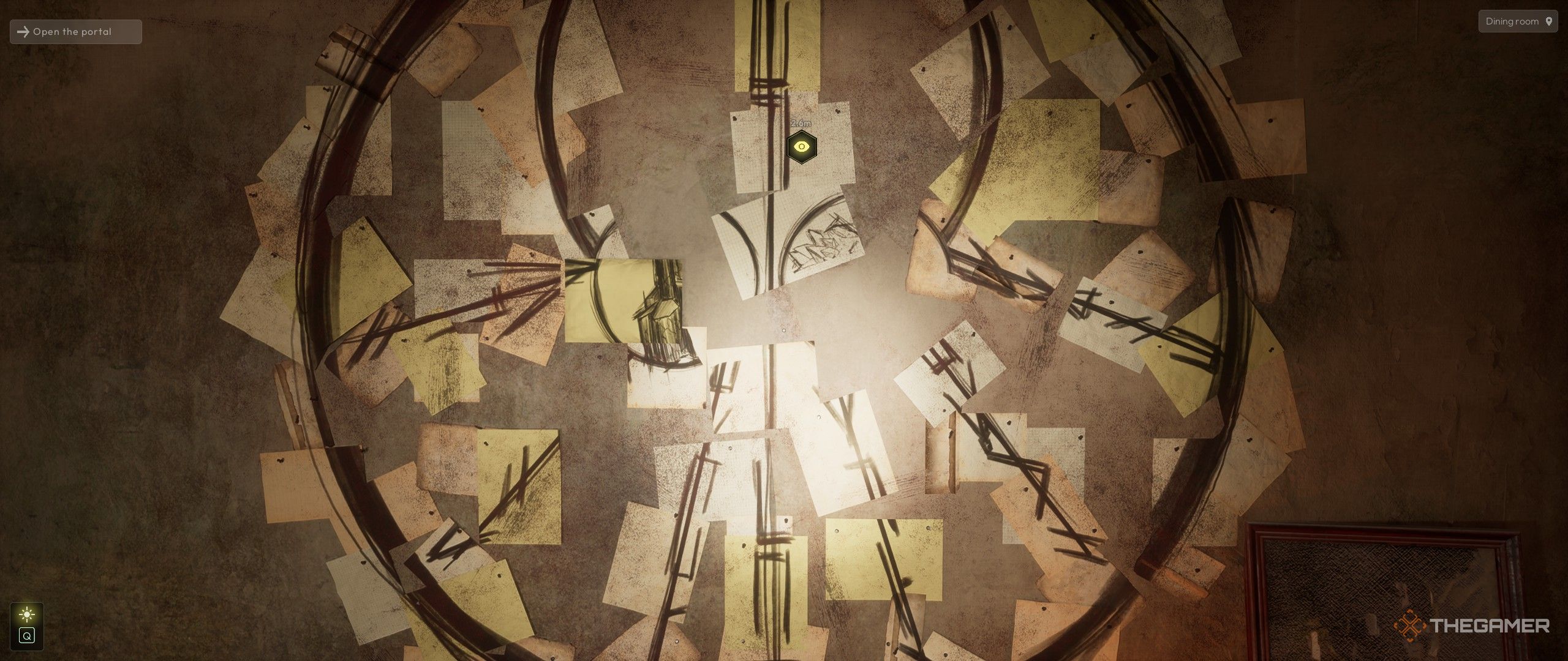 Вы найдёте полезную подсказку на первом этаже дома. В Обеденной (посмотрите на верхний правый угол экрана, чтобы подтвердить своё местоположение) на стене есть большой бумажный фреска. В ней не хватает некоторых частей! Подберите разбросанные листы бумаги на полу и столе и используйте их, чтобы завершить фреску в центре.