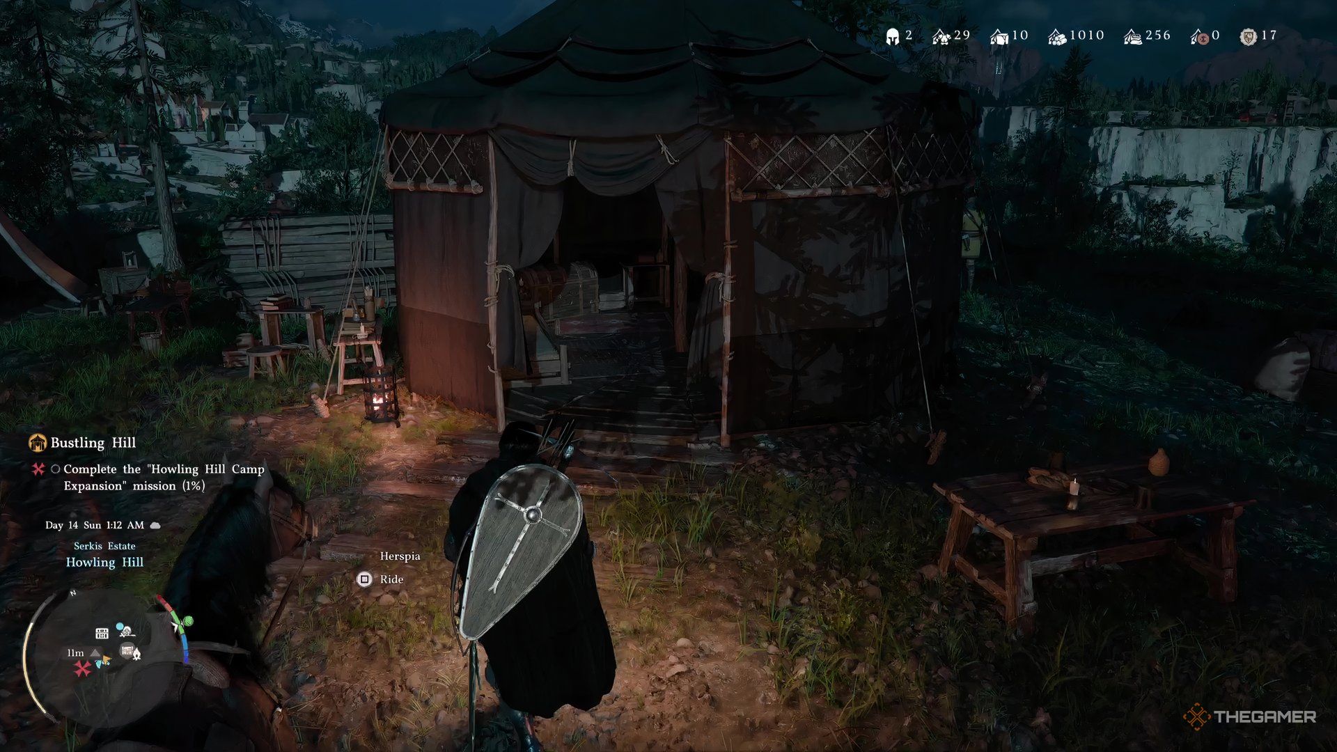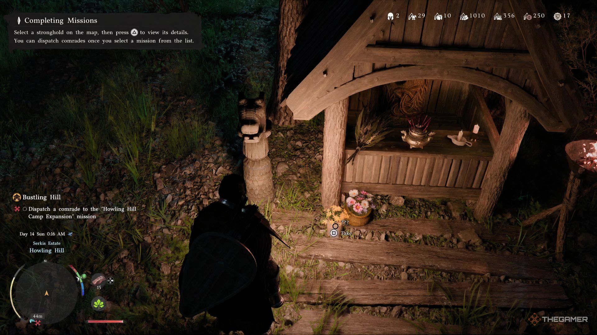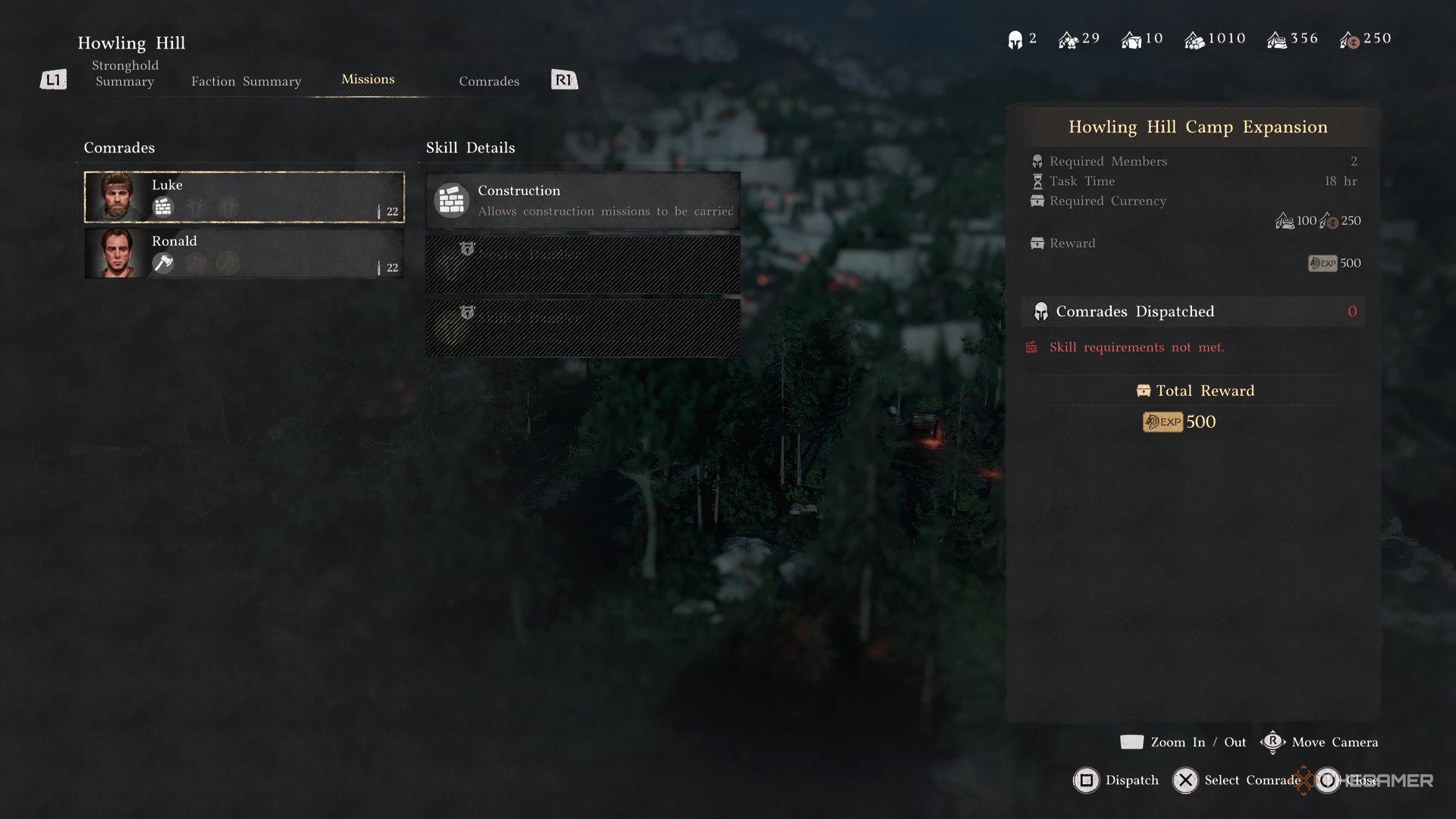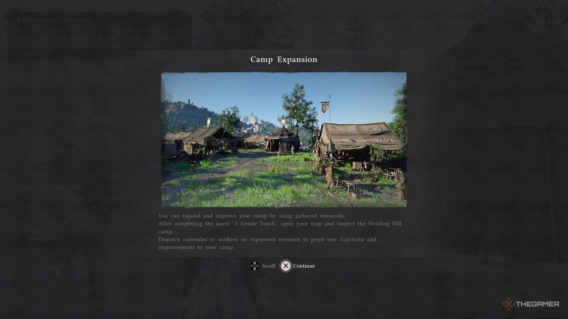 Как только сцена ненадолго фокусируется на лагере, в верхнем левом углу появится новое меню. Используйте кнопку R1 или RB, чтобы перейти на вкладку ‘Missions’. Там вы увидите только одно доступное задание: ‘Howling Hill Camp Expansion’.