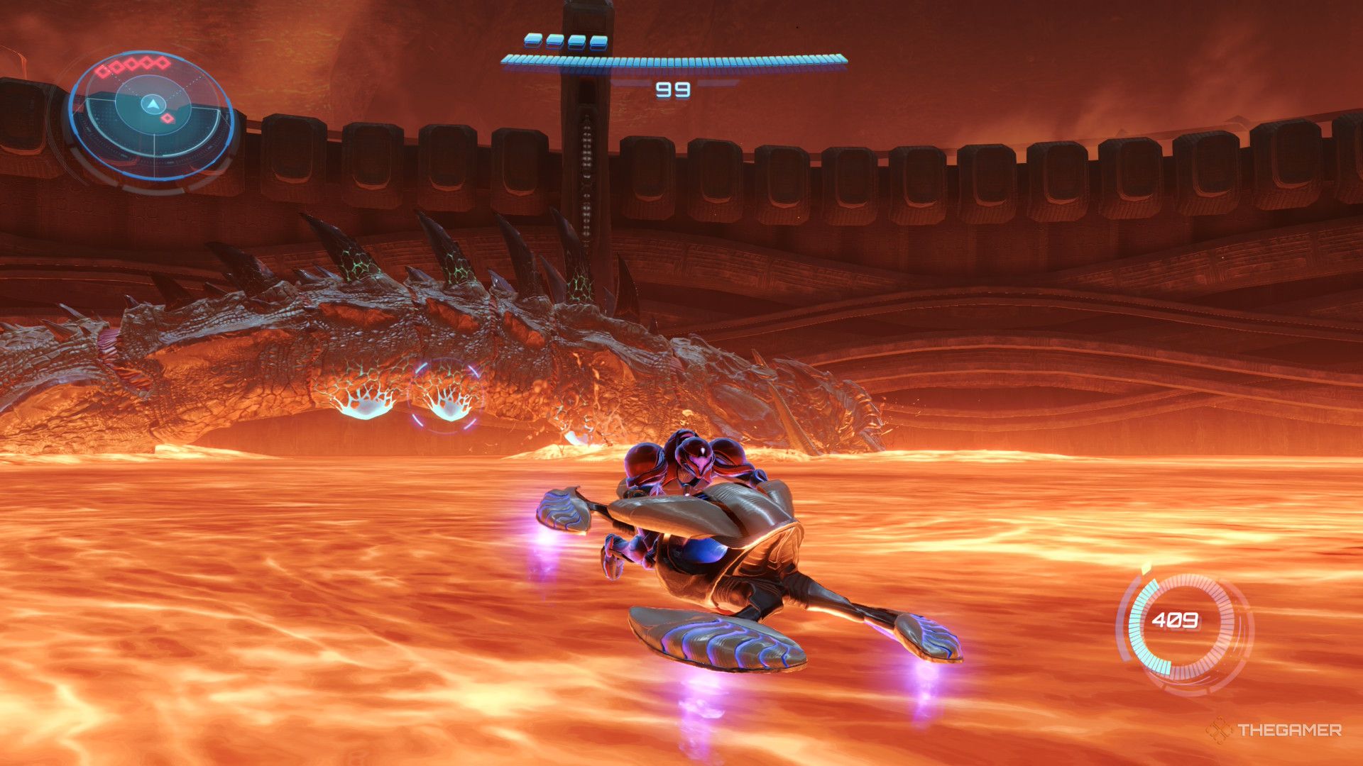 Окей, так что, когда этот бой начнётся, я полностью привязан к использованию Vi-o-la, потому что весь пол арены – лава – другого пути нет! Как только я просканирую Phenoros, мне нужно запрыгнуть на свой мотоцикл и ехать вдоль его бока, фиксируясь на этих ярких голубых гнойниках на его животе. Один выстрел из пушки Vi-o-la взорвёт эти слабые места и действительно навредит большому парню!