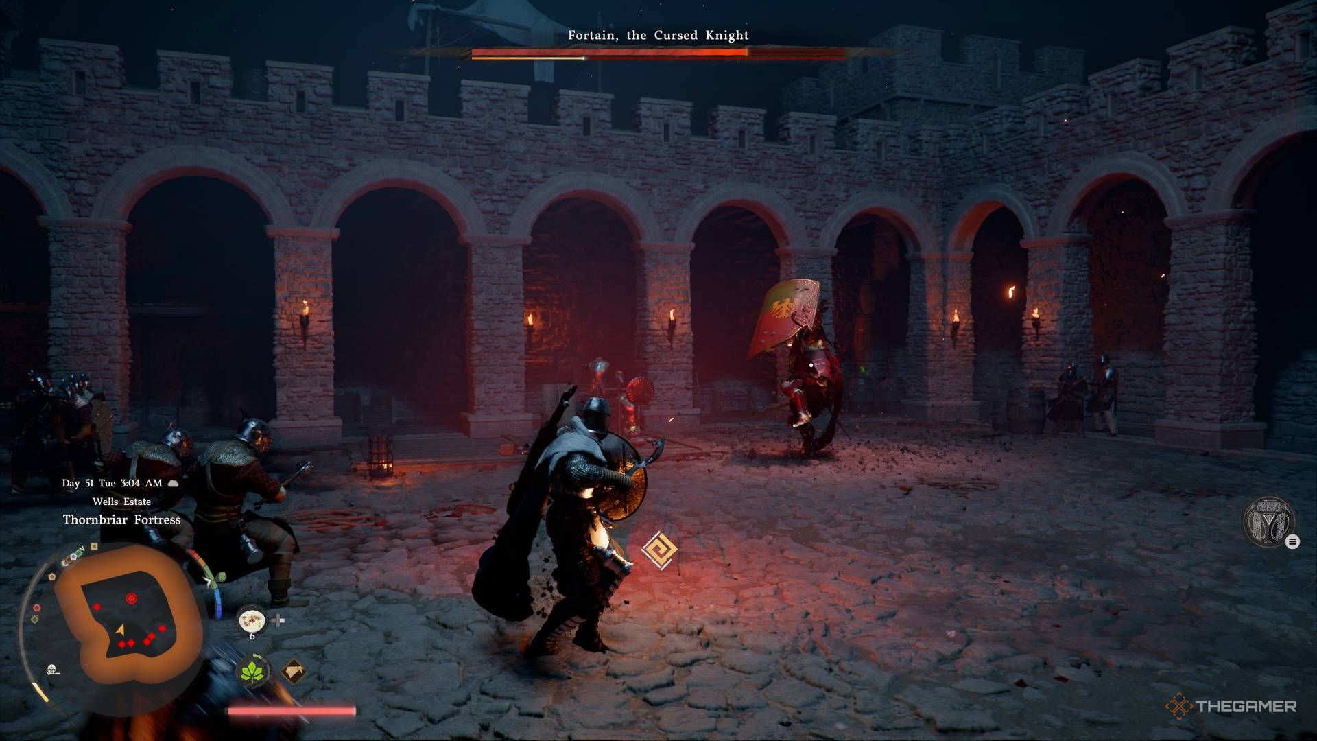 Fortain, the Cursed Knight, является сложным боссом в Crimson Desert. У него есть большой щит, который защищает его от урона, если вы не сможете сломить его стойку. Сражение также происходит на арене, заполненной вражескими солдатами, которые постоянно атакуют мощными мушкетами. Чтобы усложнить задачу, Fortain призывает двух больших, неуязвимых призрачных союзников, чтобы помочь ему в бою.