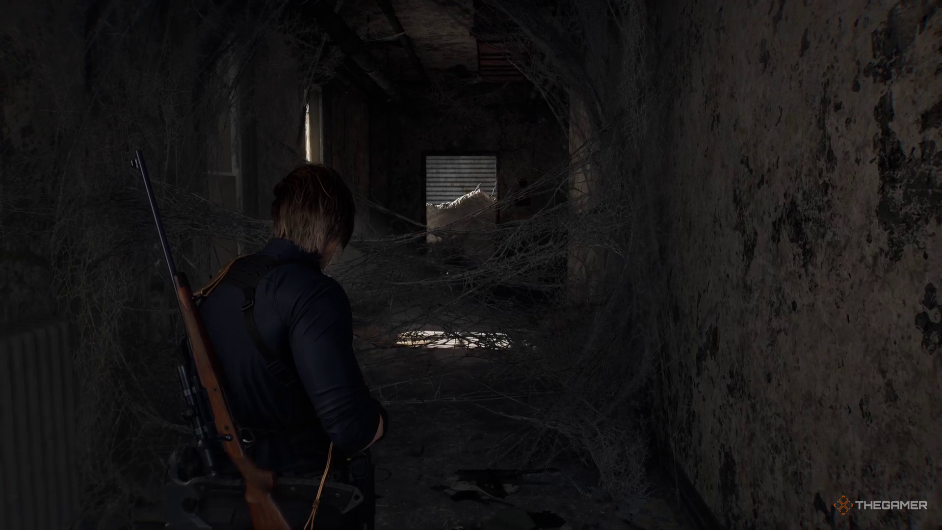Вскоре вас отбросит сквозь стену в более просторную область. Однако паук всё ещё преследует вас, поэтому как только Леон поднимется, продолжайте двигаться вперёд, прорвитесь сквозь паутину, преграждающую вам путь, и пройдите через дверь и вверх по лестнице.