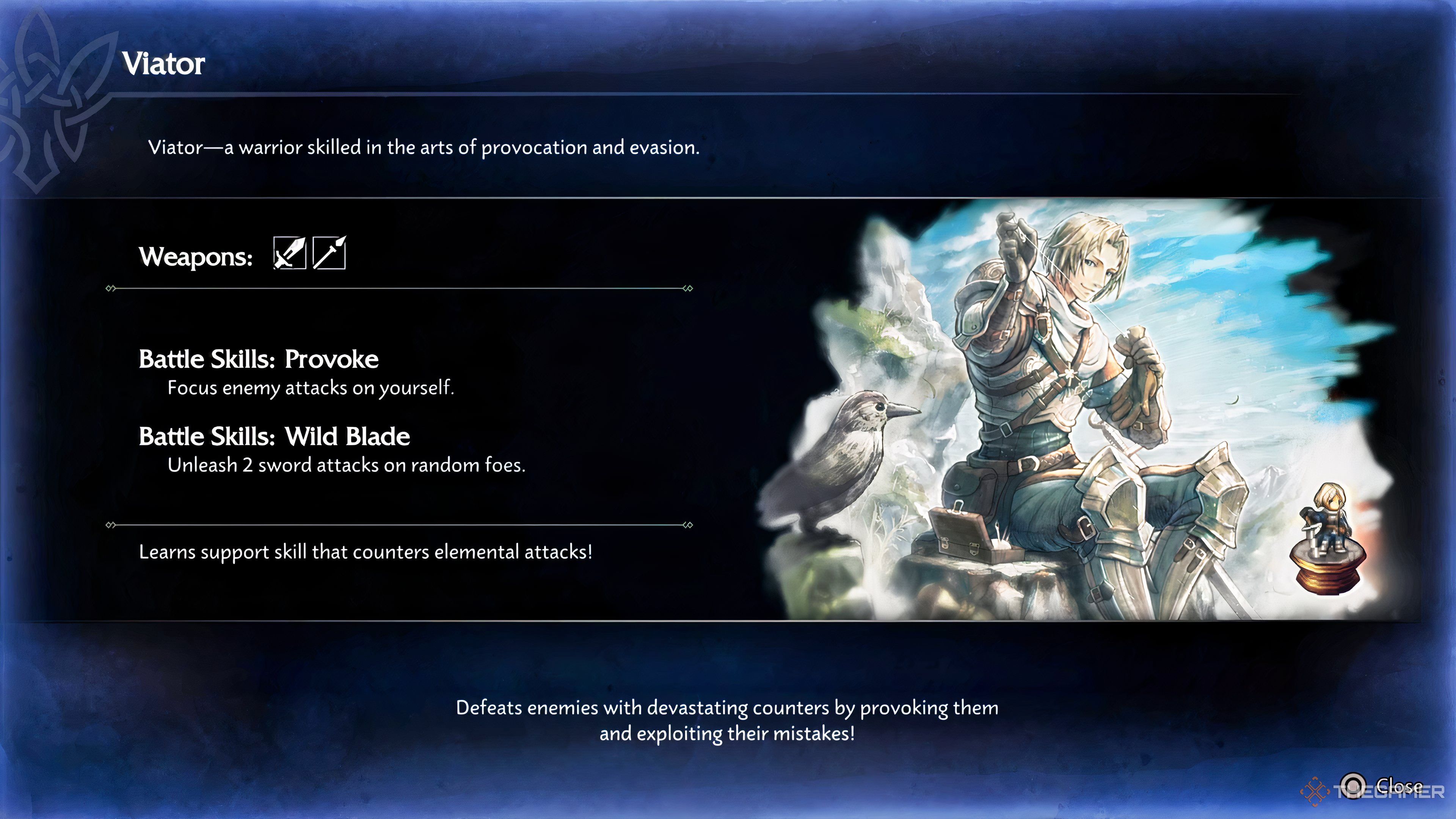 Viator – могущественный боец, владеющий как мечами, так и древковым оружием. Он особенно хорош в том, чтобы привлекать на себя атаки врагов, защищая своих товарищей по команде в начале игры. Он может полностью избежать урона, действовать быстрее в бою и имеет 50% шанс автоматически контратаковать при получении урона от элементальных атак.