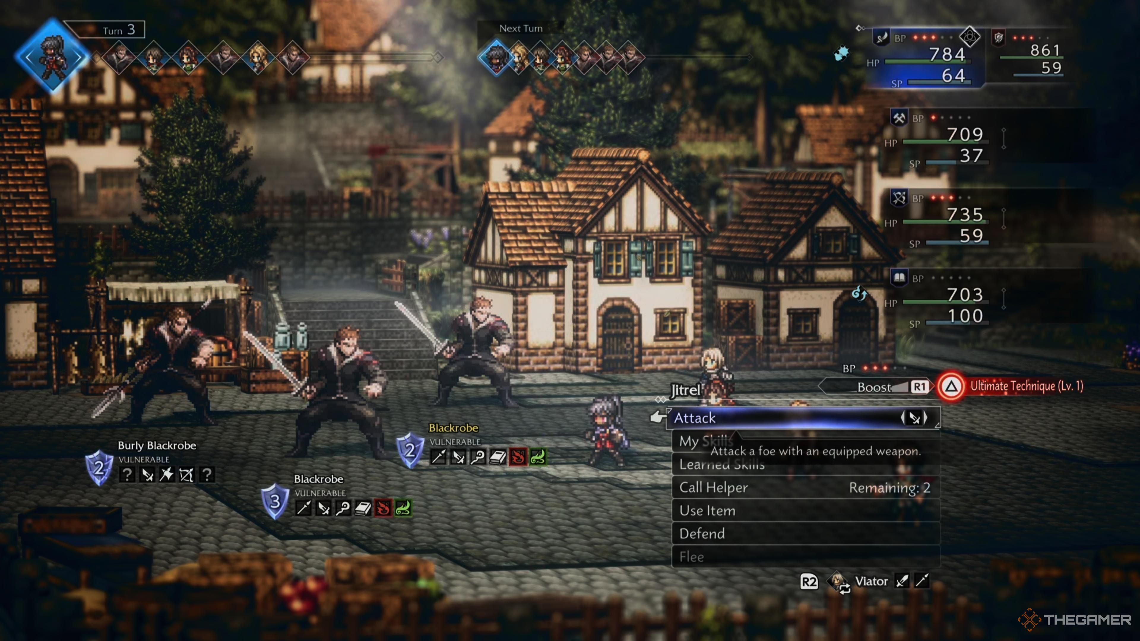 Окей, я придумал тактику для боя с Viator! Если использовать Парирование, когда Viator атакует, это полностью блокирует урон. А если вы уже использовали Провокацию, это заставит Viator сосредоточиться на вас, что отлично, потому что это останавливает его ужасный Skull Slash от попадания в кого-либо ещё – эта атака нацелена только на одного человека. Просто заставьте остальную часть вашей команды защищаться в этот ход, и у вас всё должно получиться. Как только вы это сделаете, вы официально завершили первую часть маршрута богатства – круто!