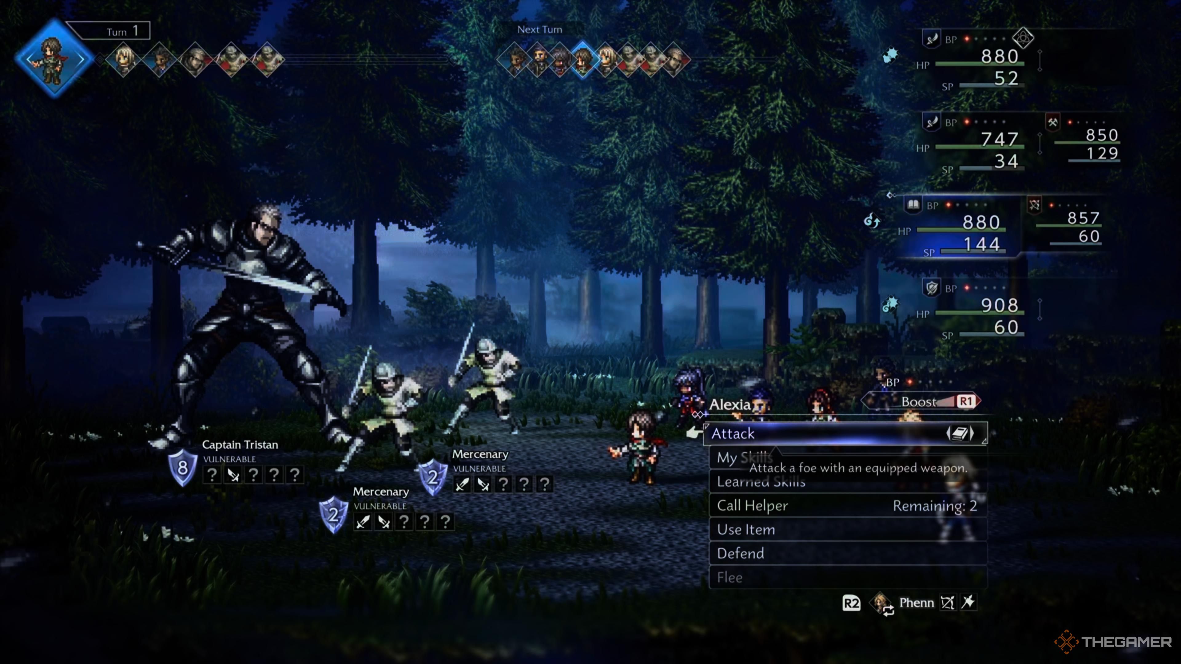 Капитан Тристан и его наёмные солдаты жаждут сразиться с Герминией и немедленно атакуют вашу группу. Сложность боя будет зависеть от того, кто сейчас в вашей команде, но вы должны быть в состоянии победить Тристана и его наёмников без особых усилий.