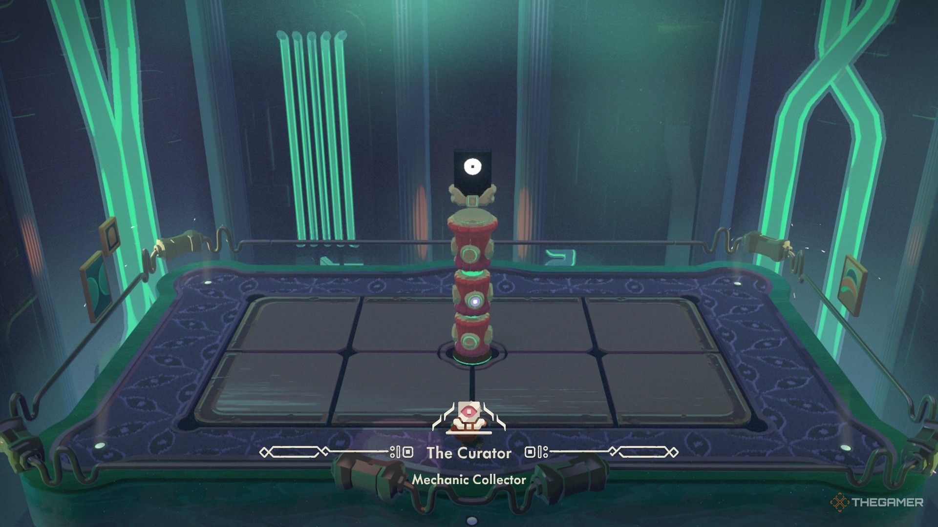 После получения значительного урона, The Curator вернётся к фиолетовым объектам и будет чередовать атаки. Как только вы нанесете около 60% его здоровья, вы сможете повредить нижний тотем, используя свой рюкзак.