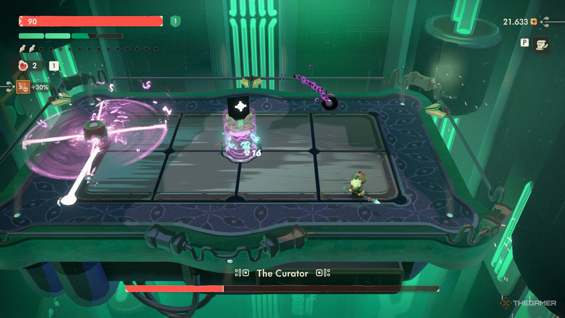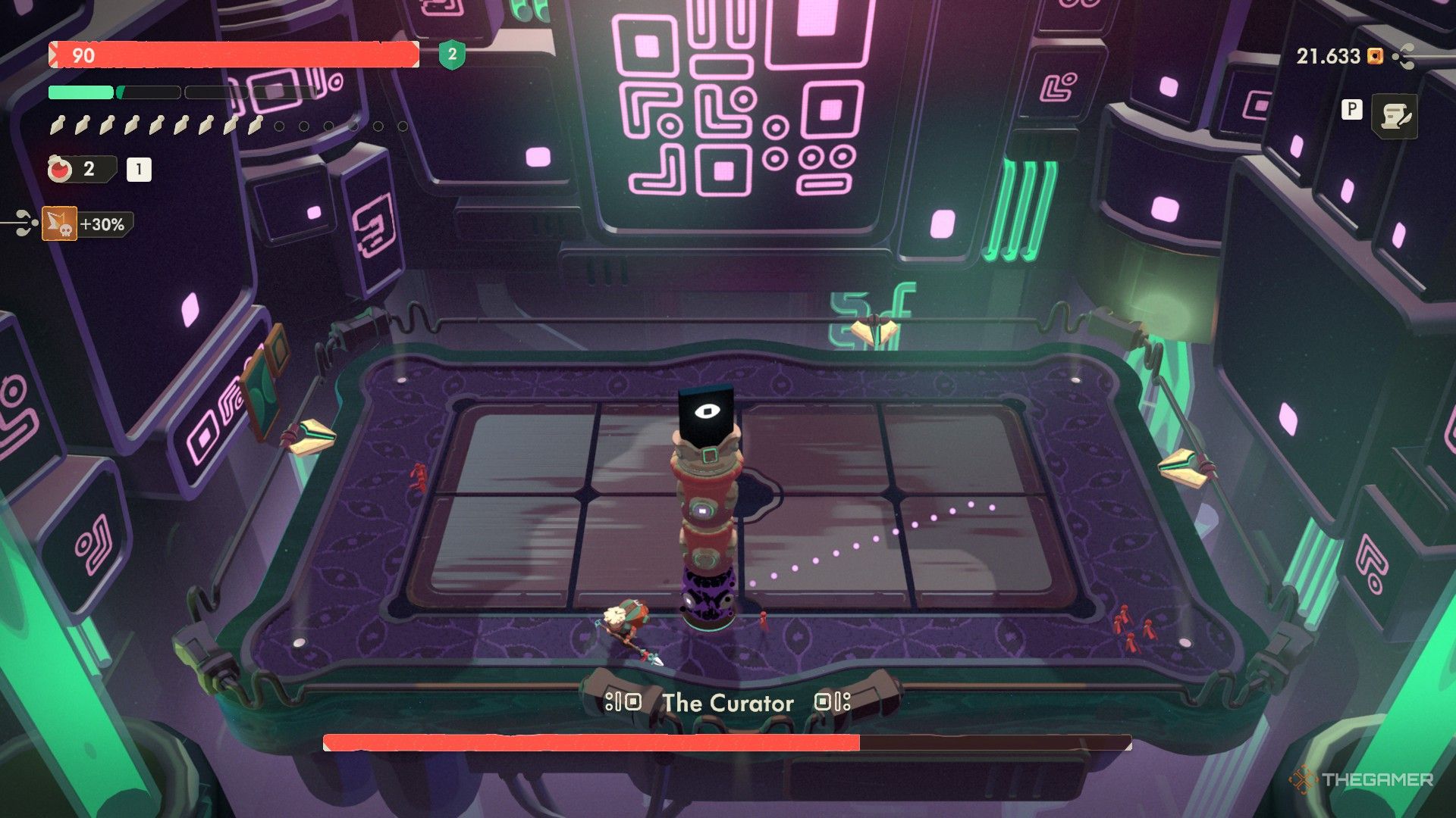 После получения значительного урона, The Curator вернётся к фиолетовым объектам и будет чередовать атаки. Как только вы нанесете около 60% его здоровья, вы сможете повредить нижний тотем, используя свой рюкзак.