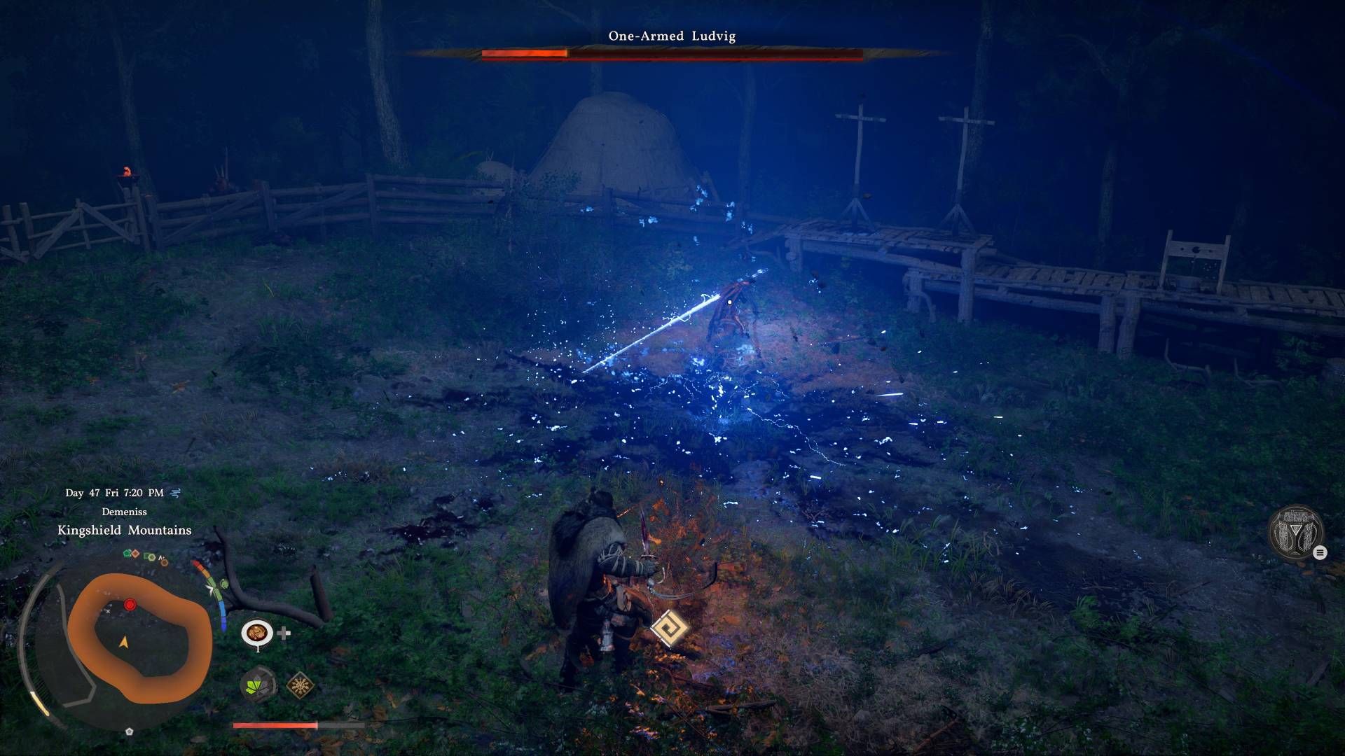 Лучшая тактика — уклоняться от атак Людвига и искать возможность нанести удар, когда он ненадолго останавливается. Он сложный противник, даже если вы используете более быстрые одноручные мечи.
