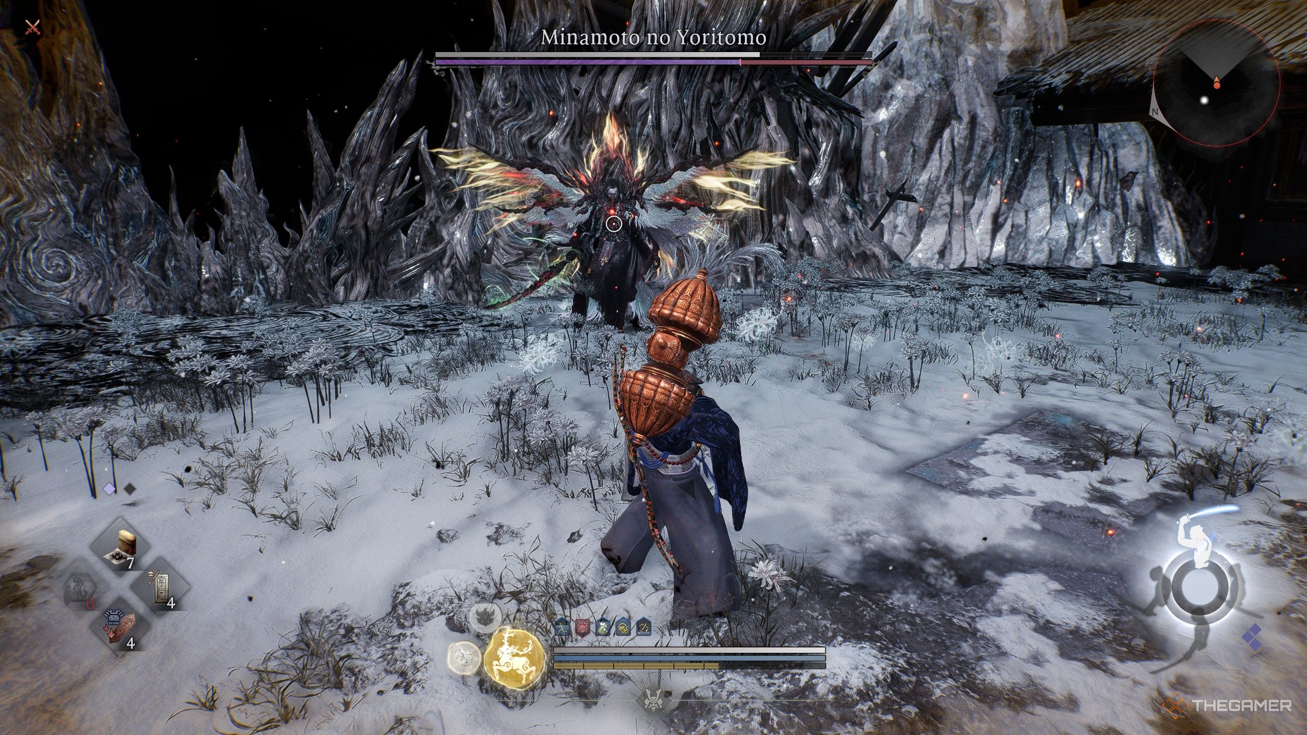 По мере начала битвы, Ёритомо будет использовать свой большой радиус поражения и быстрые движения, чтобы постоянно атаковать вас. Он в основном будет наносить серию атак клинком, от которых вы можете защититься. Он также посылает порывы ветра и быстро перемещается по арене, чтобы дважды нанести вам удар.