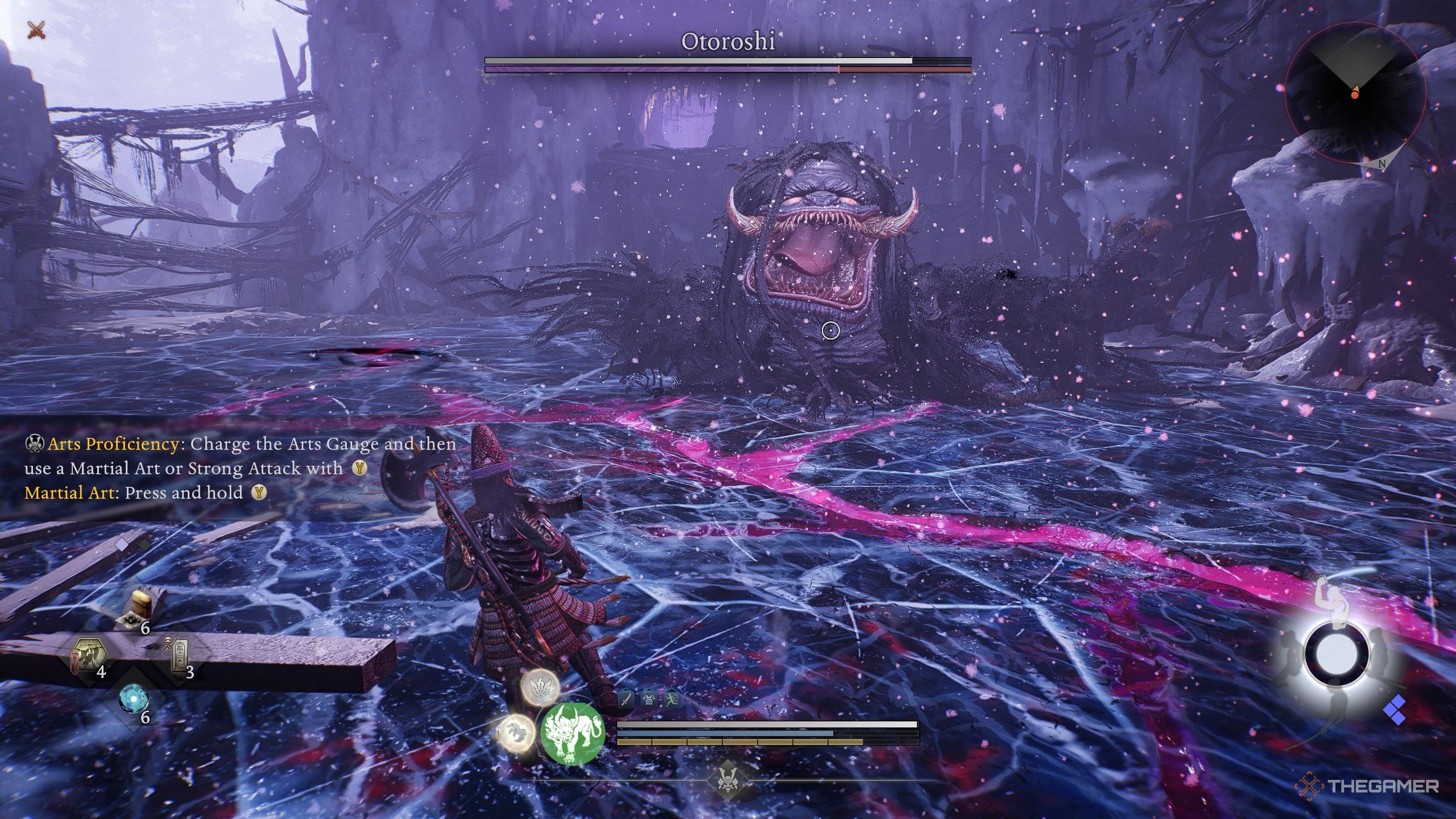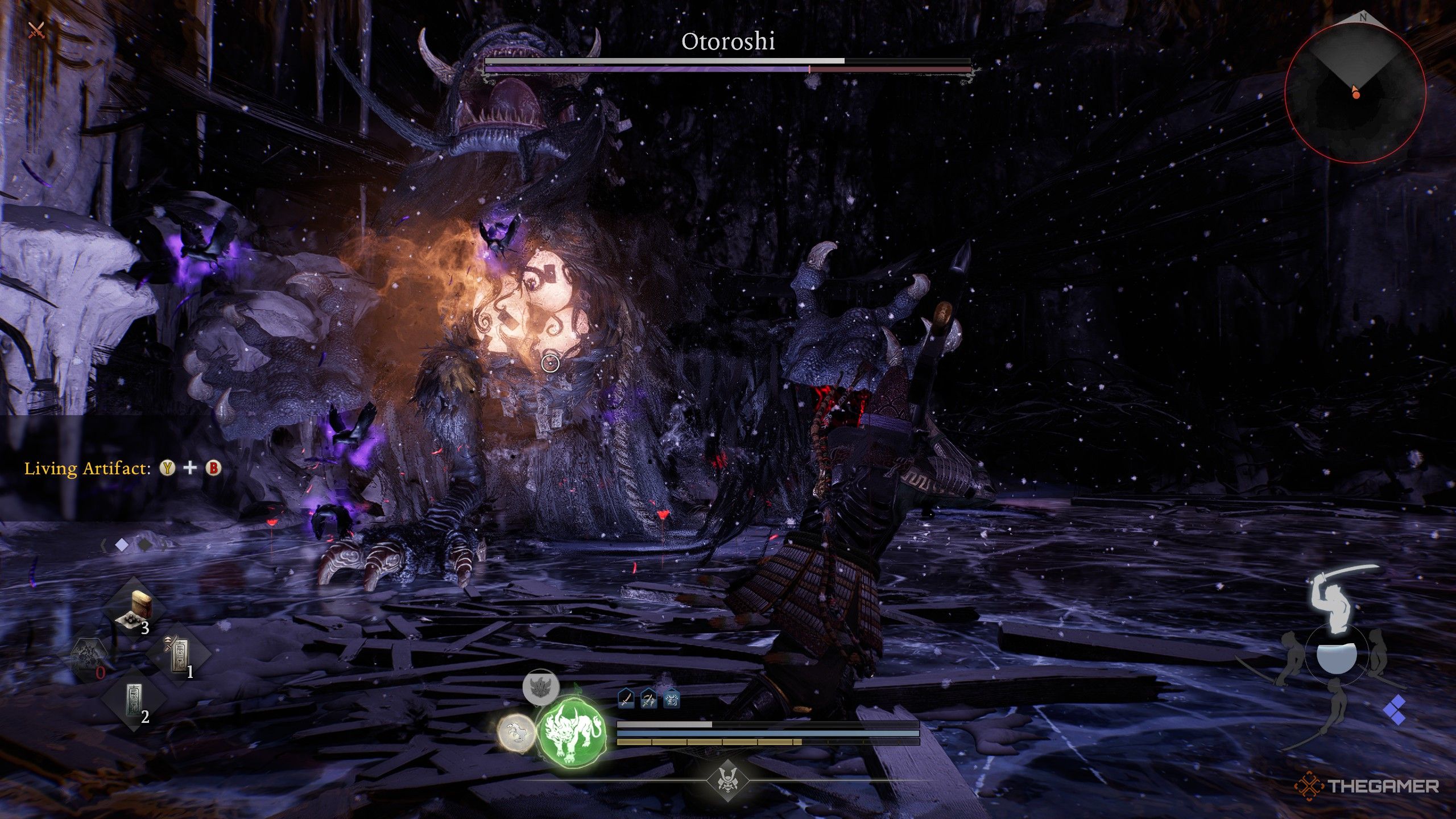 Как фанат, я заметил, что у Отороши есть атака, где он просто многократно бьёт оружием по земле. Затем он переходит к большой вращающейся атаке, которая покрывает большую часть арены! Ключ к её избежанию? Не позволяйте ему держать дистанцию. Подходите ближе и не давайте ему пространства, необходимого для её подготовки – так вы останетесь в безопасности!