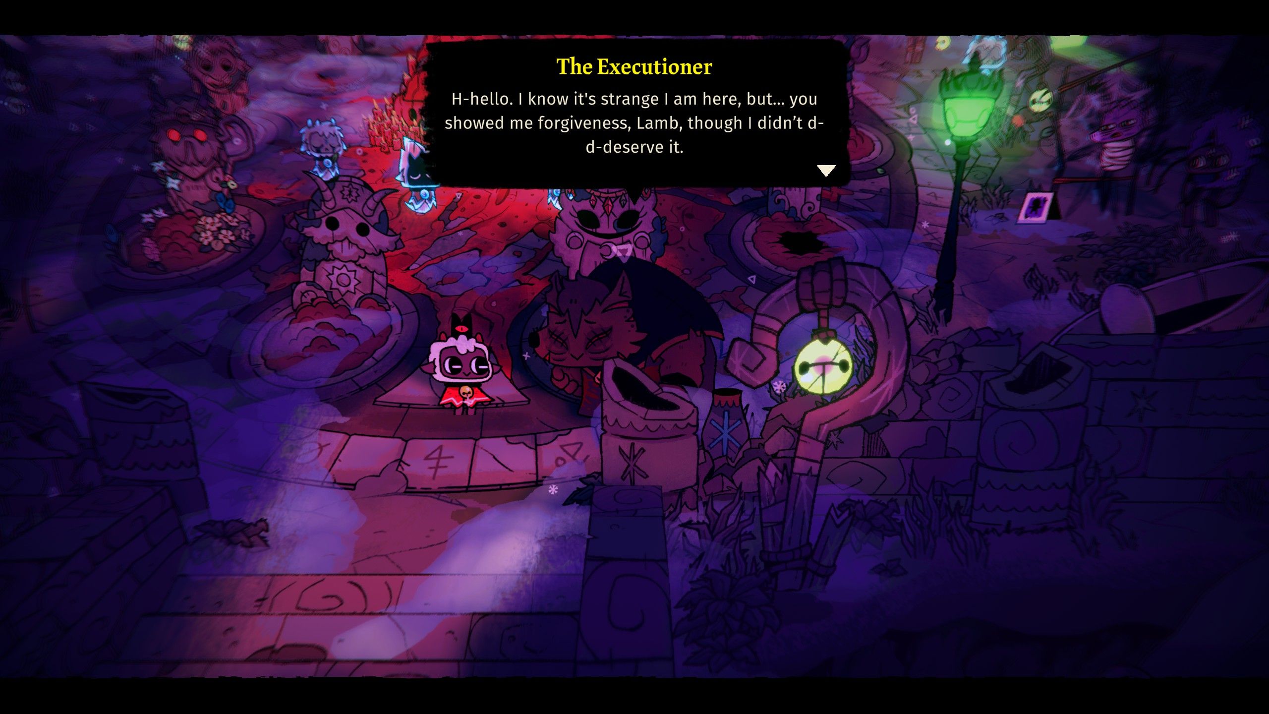 Поговорите с Палачом, затем продолжайте играть, пока он снова не появится в городе. Жители города, теперь призраки, потребуют его смерти, и вам придется решить, казнить его снова или нет. В этот раз пощадите Палача – он присоединится к вашему культу как последователь.
