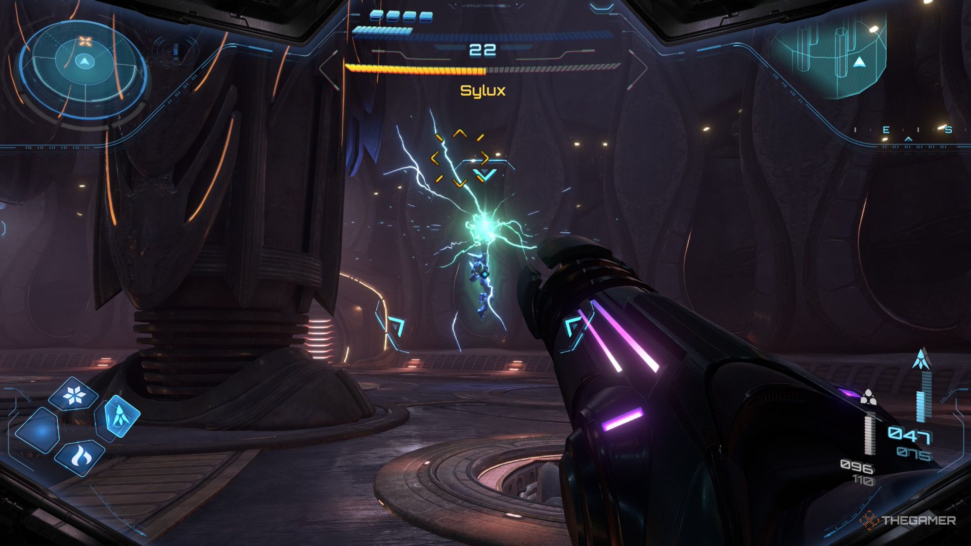 Вам не придется беспокоиться о том, что Sylux выкинет какие-либо новые трюки во время этого сражения. Ключ к победе над ним — постоянно двигаться и использовать колонны на арене, чтобы защитить себя от его атак. Также не забудьте уничтожать ракеты, которые он запускает — это ваш основной способ восстановления здоровья на протяжении всего боя.