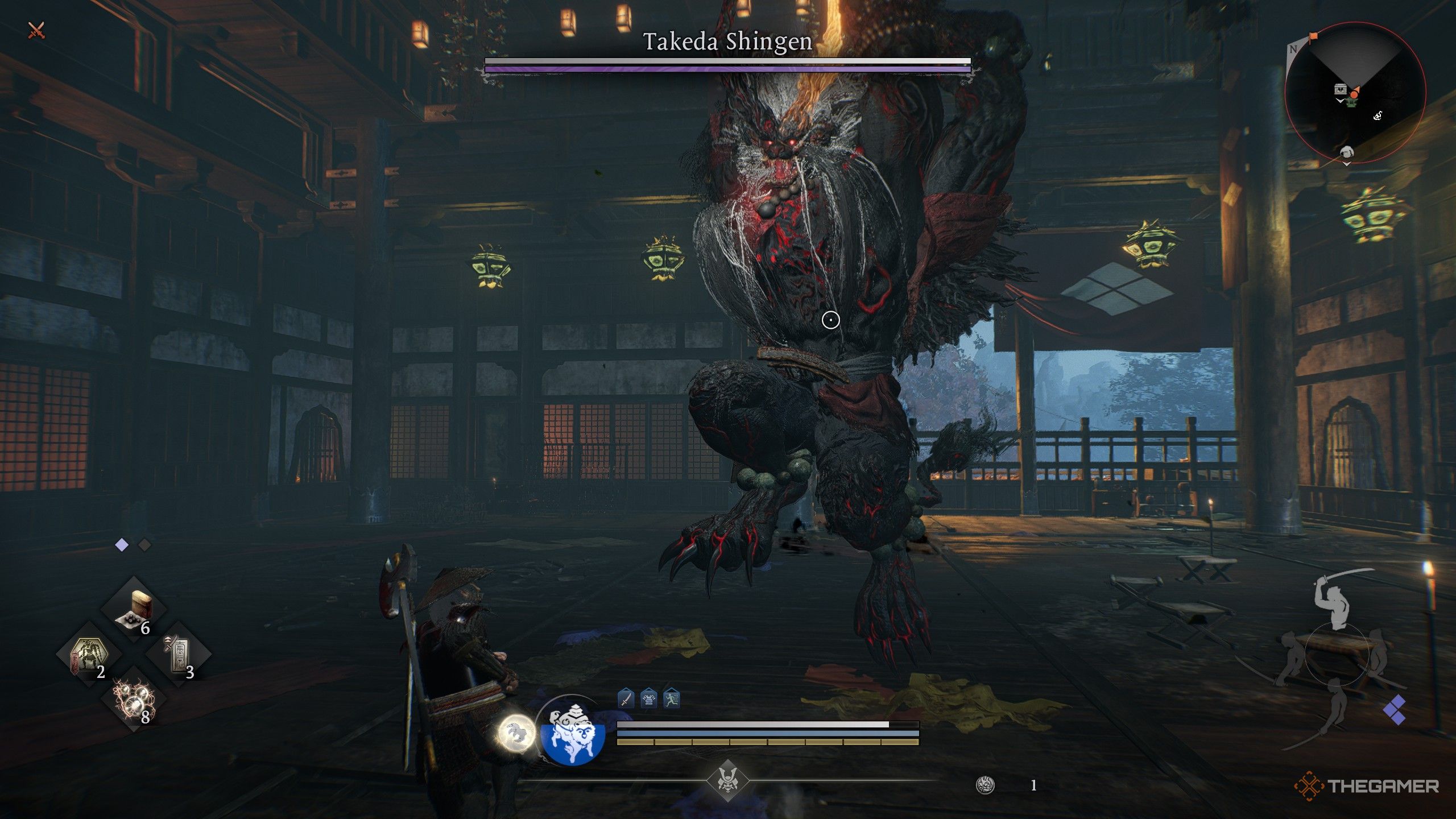 Такеда Шинген превратился в огромного демона с четырьмя руками, который атакует серией быстрых ударов. Несмотря на свои размеры, он на удивление быстр. Хотя его атаки не мгновенно смертельны, он комбинирует урон ветром и огнём в некоторых из своих атак. Я предлагаю надеть броню или амулеты, которые обеспечивают сопротивление ветру или огню, чтобы помочь вам выжить.