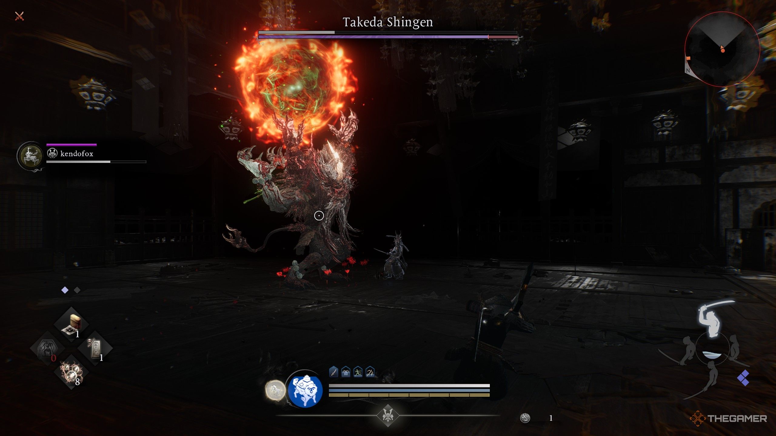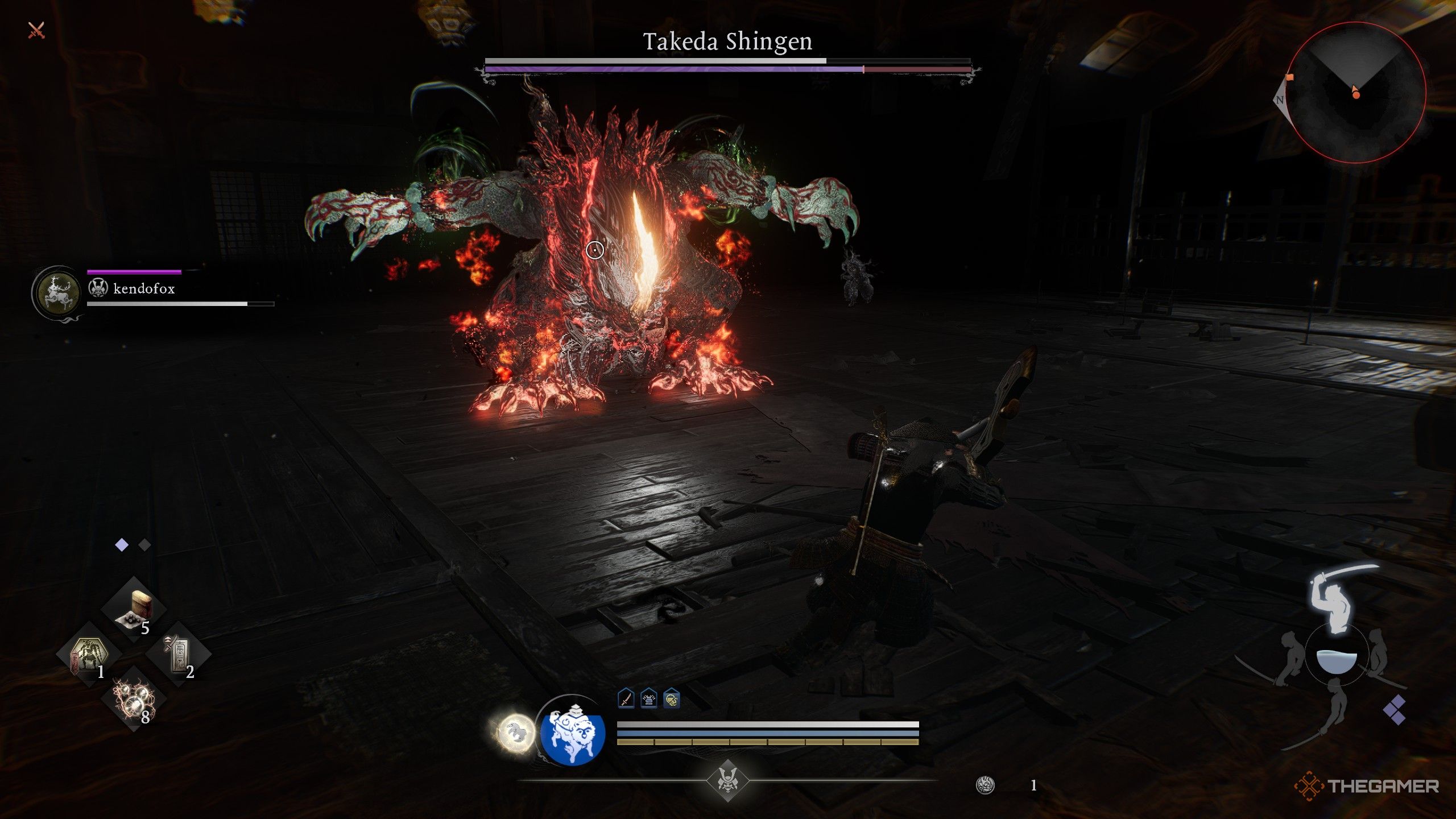 Такеда Шинген превратился в огромного демона с четырьмя руками, который атакует серией быстрых ударов. Несмотря на свои размеры, он на удивление быстр. Хотя его атаки не мгновенно смертельны, он комбинирует урон ветром и огнём в некоторых из своих атак. Я предлагаю надеть броню или амулеты, которые обеспечивают сопротивление ветру или огню, чтобы помочь вам выжить.