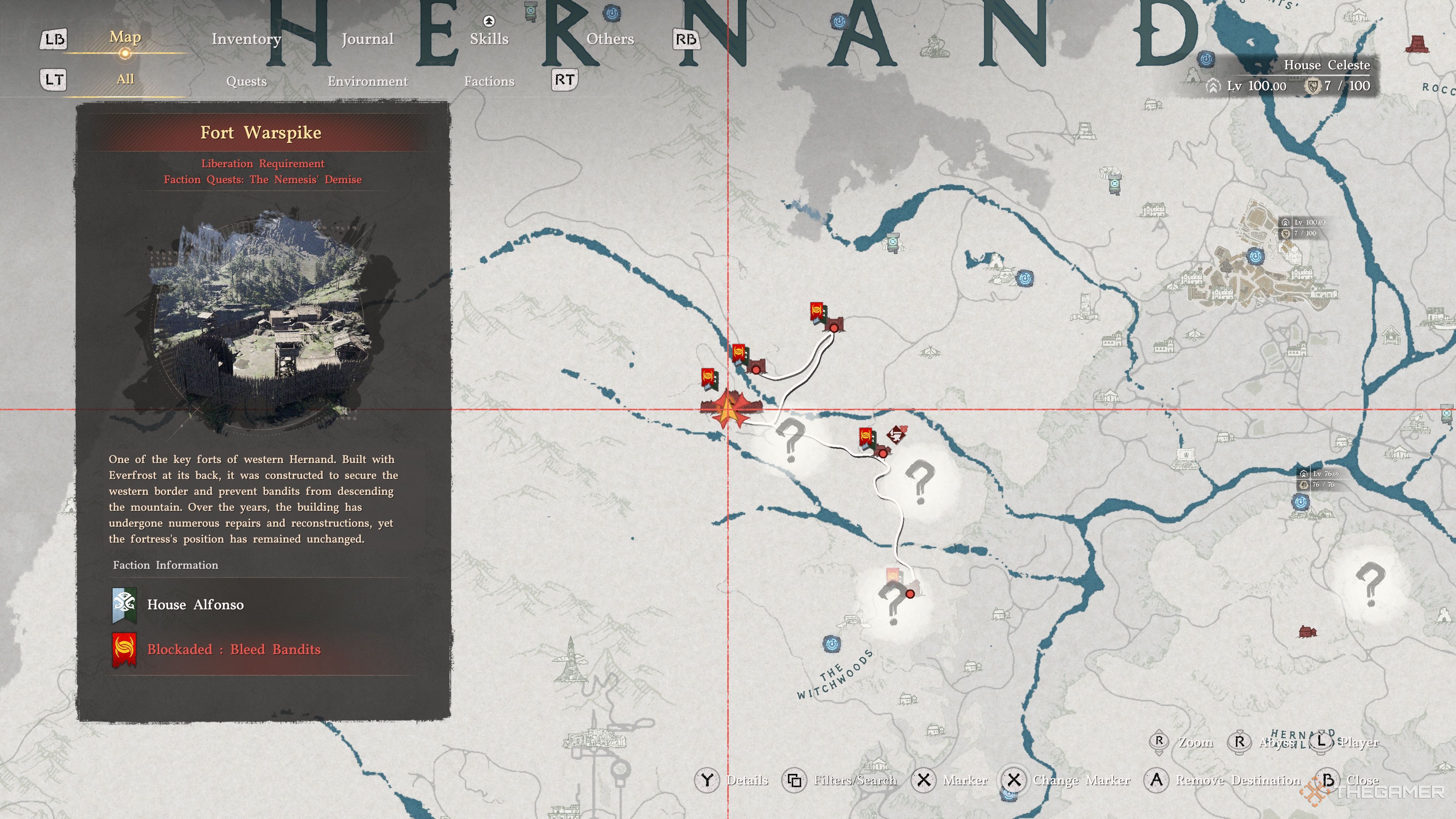После того, как вы поговорили со слугой Алана Серкиса и получили инструкции, отправляйтесь в Forth Warspike. Он расположен к северо-западу от The Witchwoods и непосредственно к югу от буквы ‘N’ в ‘Hernand’.