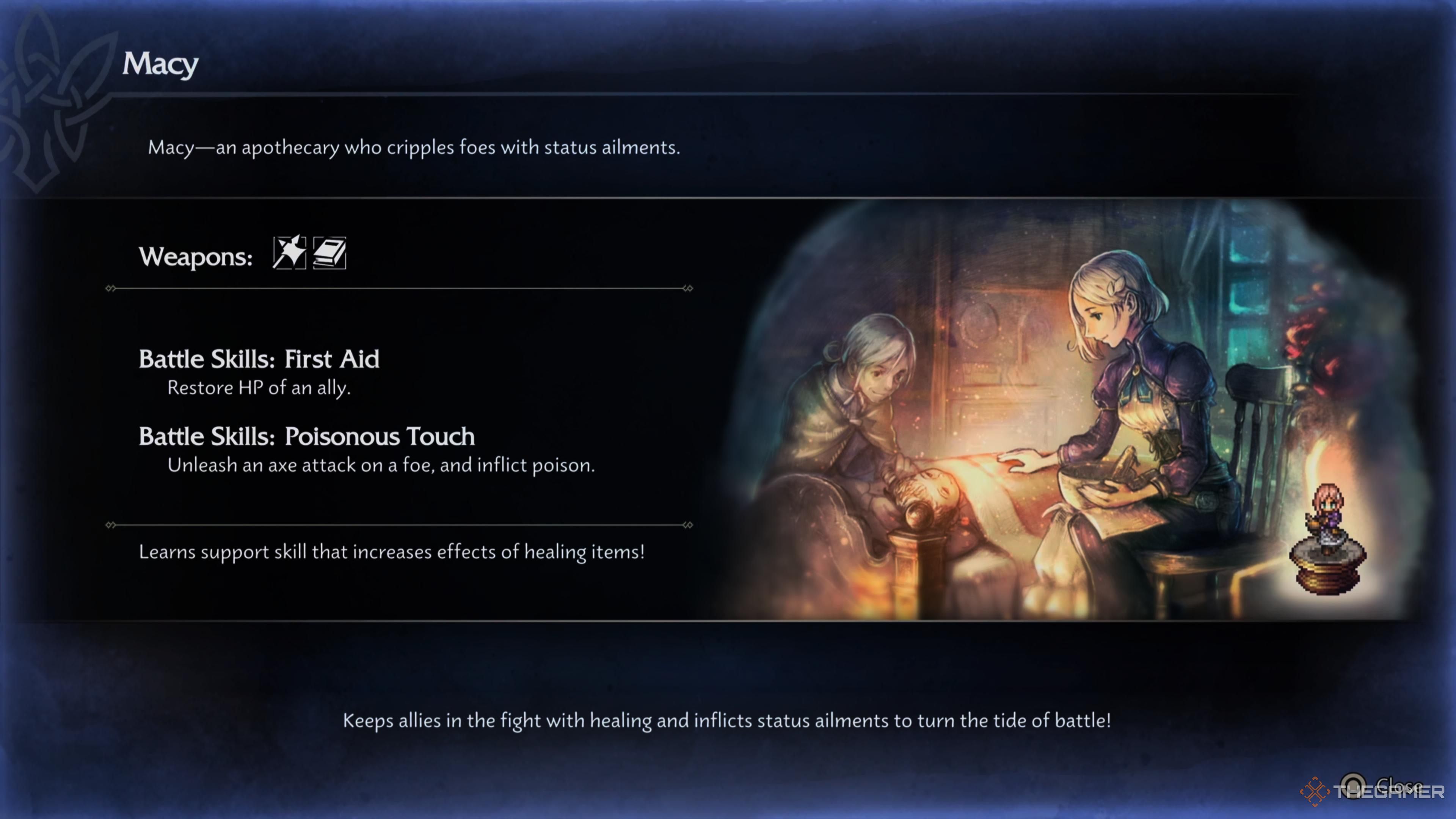 Мэйси, подобно Стие, может лечить своих товарищей по команде с помощью Первой помощи. Что делает Мэйси особенной, так это её Ядовитое прикосновение, которое даёт ей шанс отравить врагов, которых она атакует топором. У неё также есть Формула паралича, позволяющая ей потенциально парализовать противников.