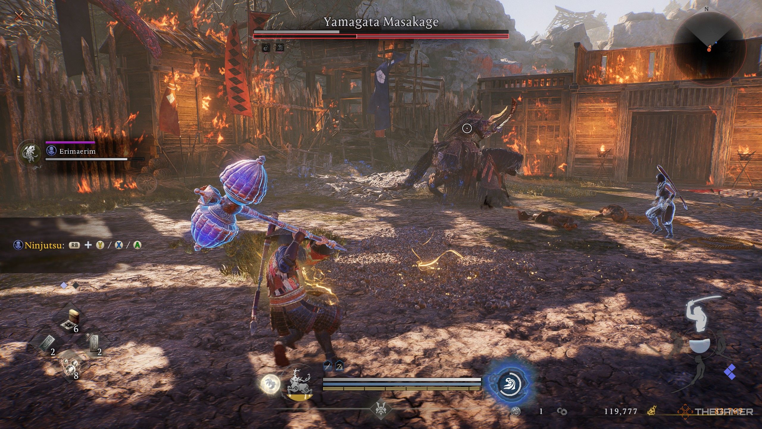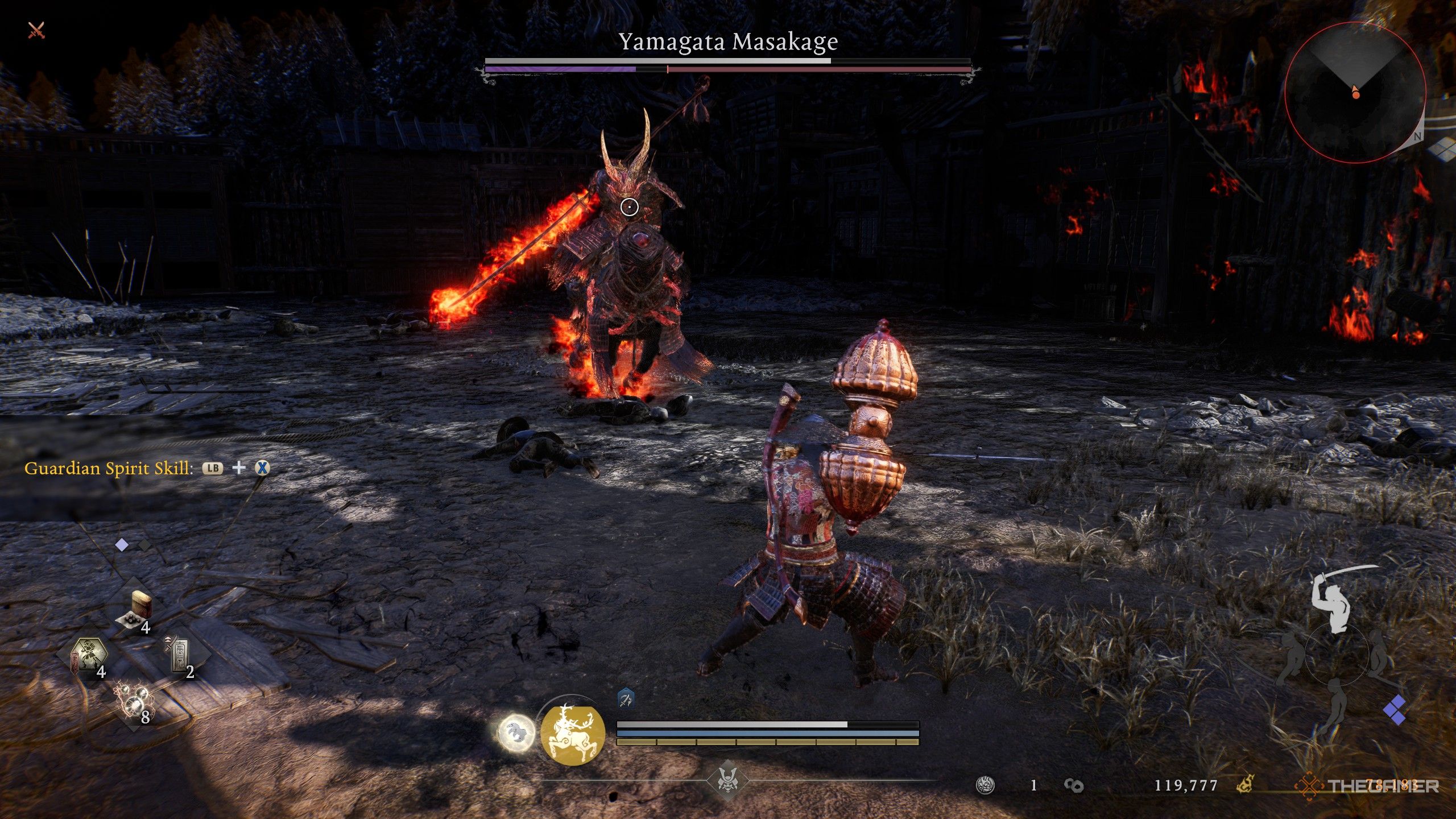 Масакаге может создать пространство и стрелять огненными стрелами в вашу сторону. Если вы видите, как он натягивает лук, быстро подбегите к нему и попробуйте обойти его лошадь сбоку. Он замирает на время этого действия, давая вам возможность подобраться и атаковать. У него также есть атака копьем, где он бросается вперед и тащит копье по земле. Вы можете легко избежать этого, перекатившись в любую сторону прямо перед тем, как копье вас заденет.