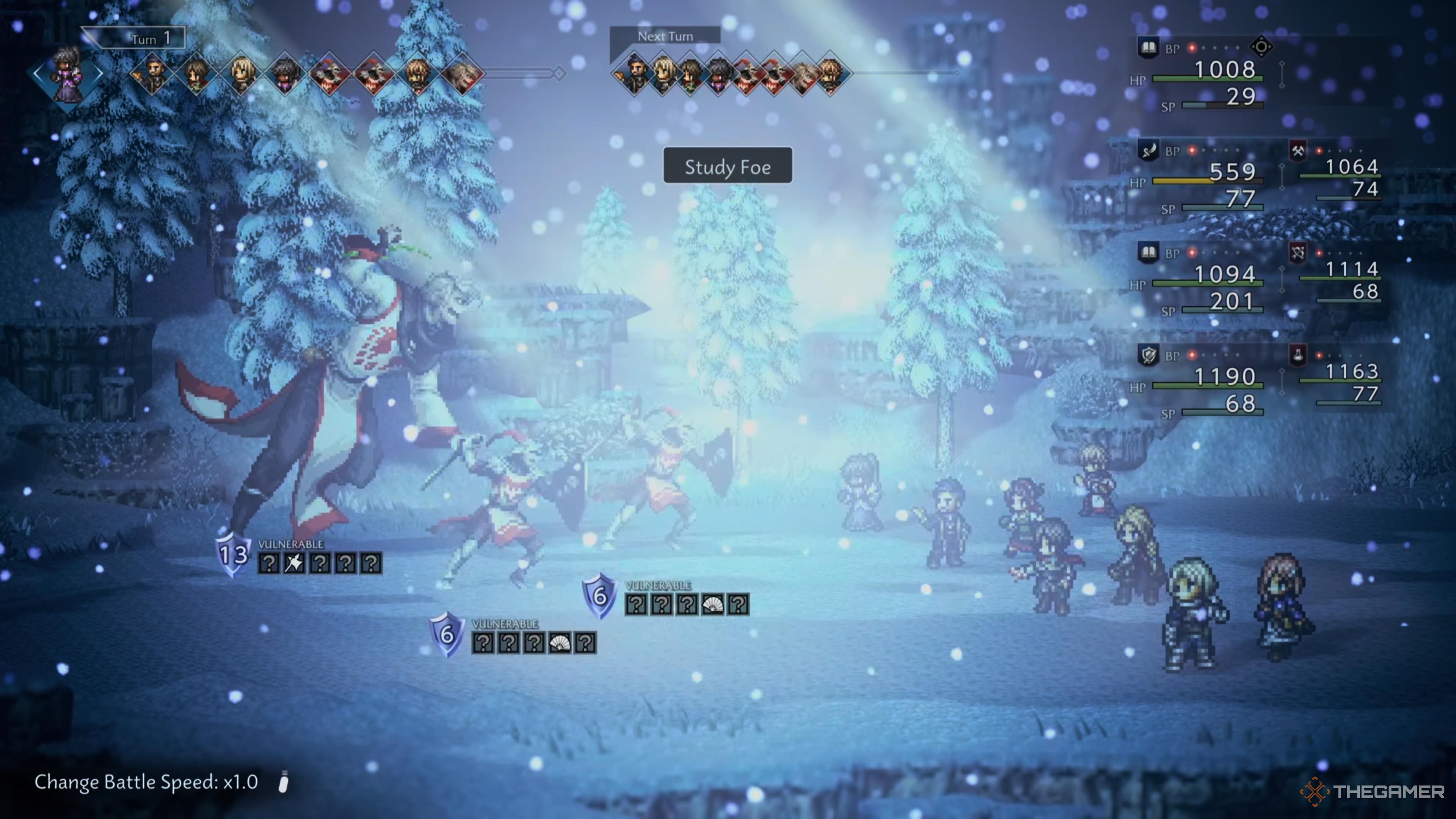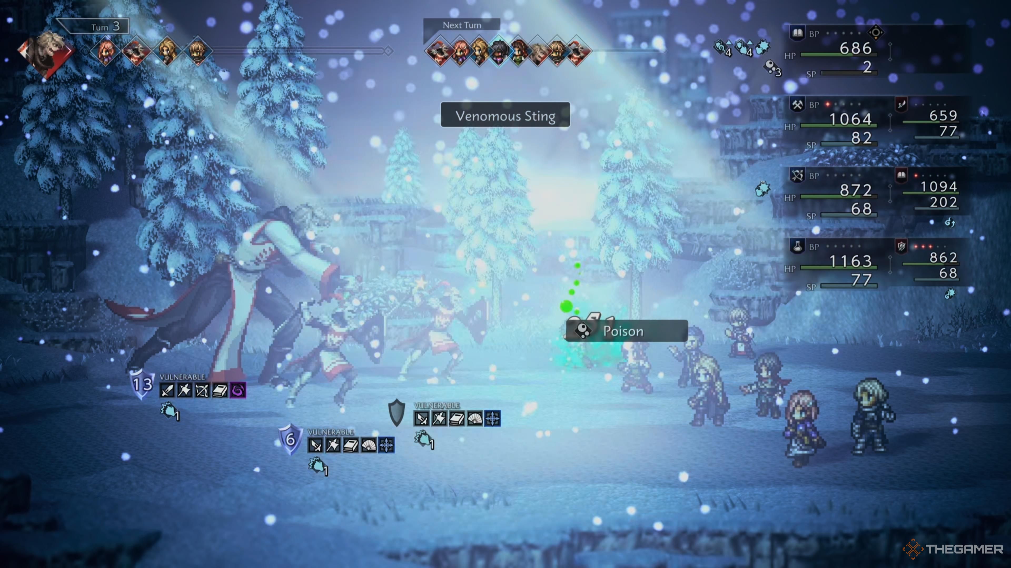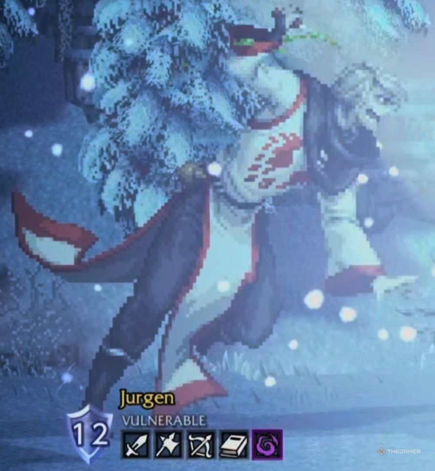 Игла Летности Юрген наносит урон одному члену отряда, нанося значительный урон и делая его уязвимым к элементальным атакам.