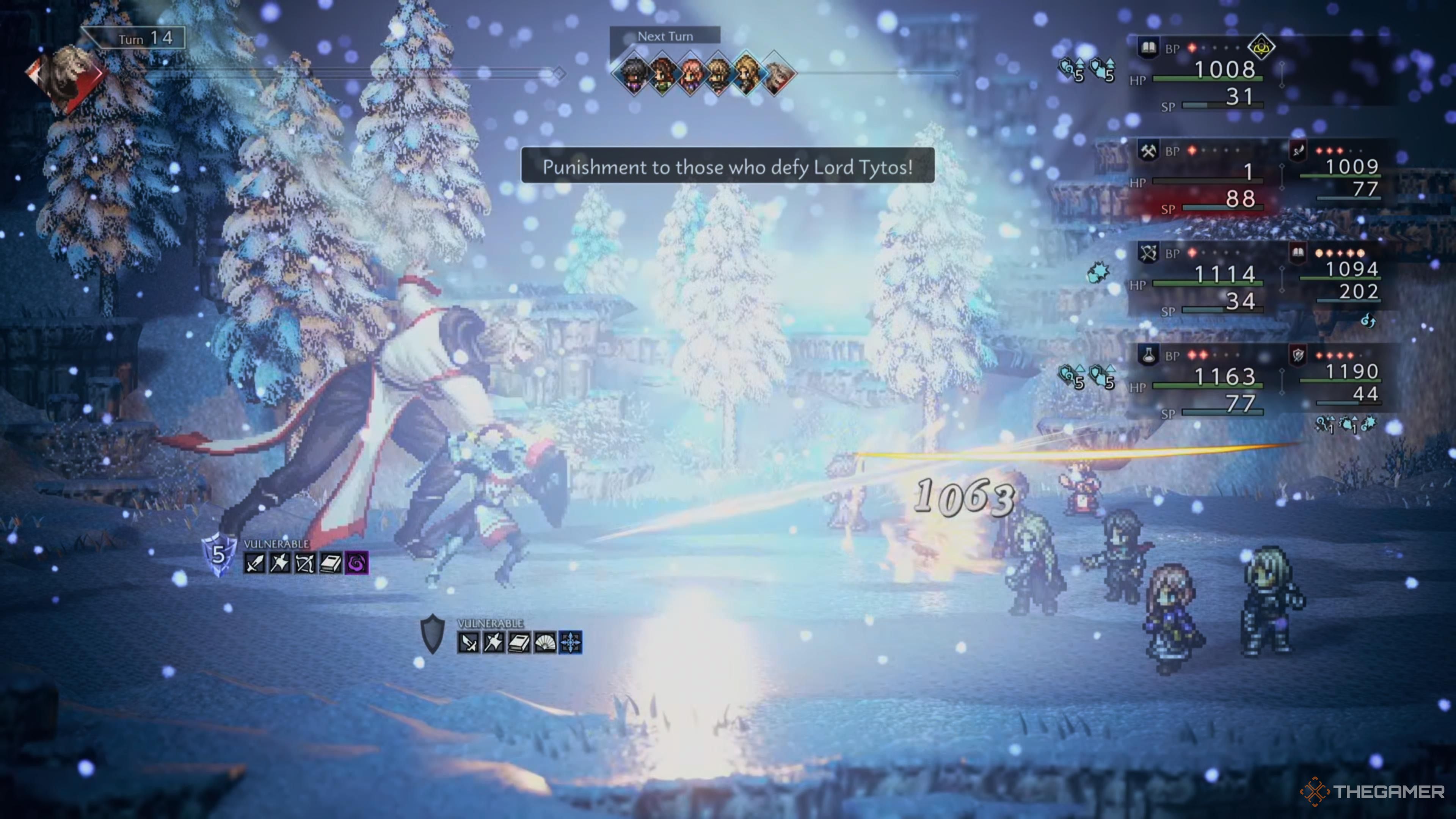 Наказание тем, кто ослушивается лорда Титоса После подготовки к ходу, Юрген наносит удар по одному члену отряда, оставляя его с одной единицей здоровья.
