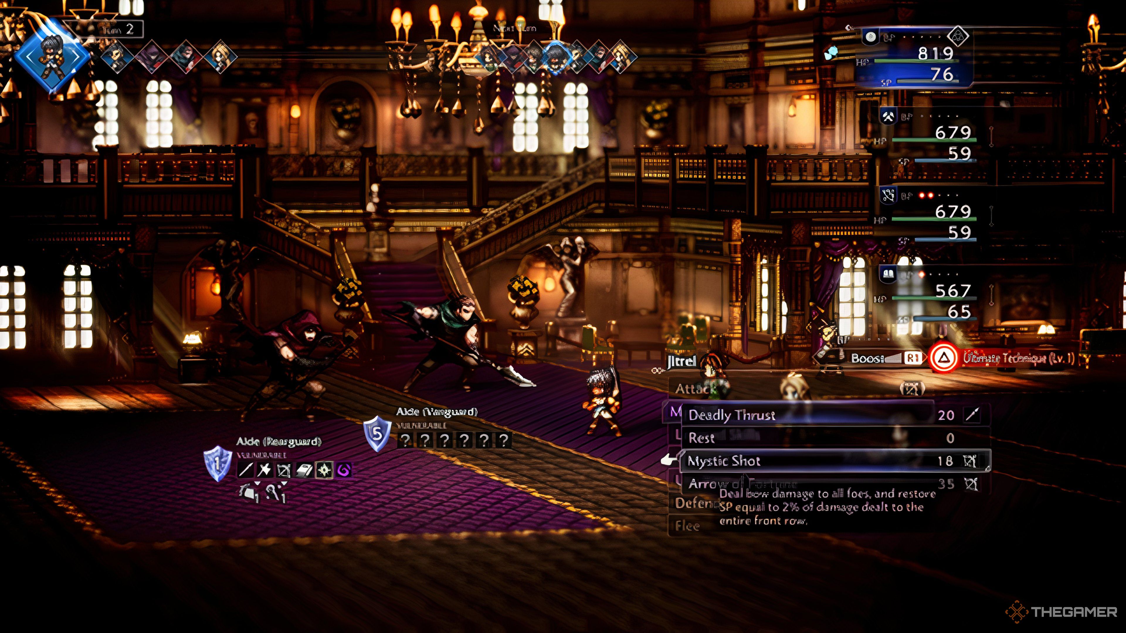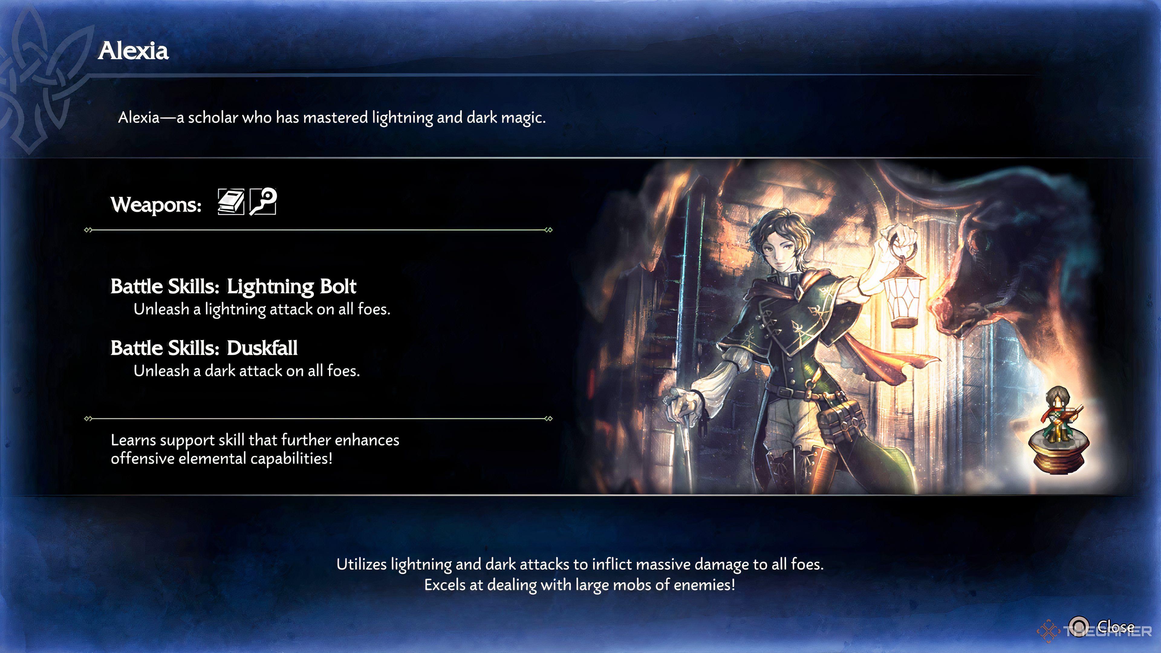 Алексия – ценный член команды с самого начала, позволяющий вам обнаруживать слабые места врагов. Это особенно полезно, если у вас нет персонажа, умеющего анализировать, а также она предоставляет доступ к элементальным атакам как Молнии, так и Тьмы.