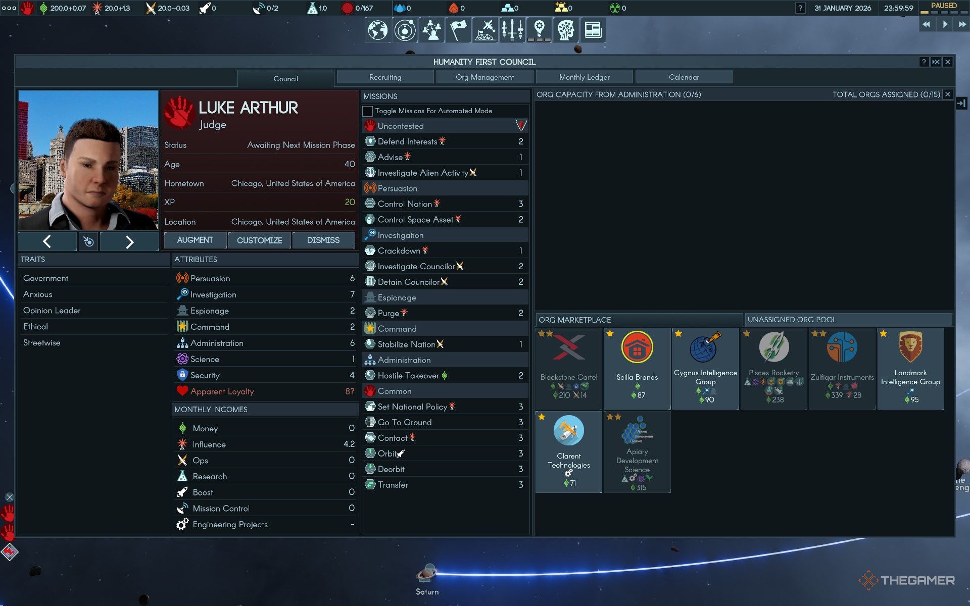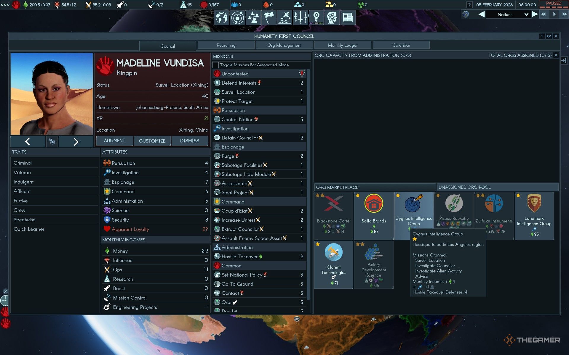 В Terra Invicta, управляя миссиями для советников вашей фракции, они могут получить доступ к различным группам, называемым организациями (или ‘орг’ для краткости). Это по сути уже существующие группы, такие как правительства, агентства, преступные сети и рынки. При сотрудничестве с советником, эти орги предоставляют преимущества как этому человеку, так и вашей фракции в целом.