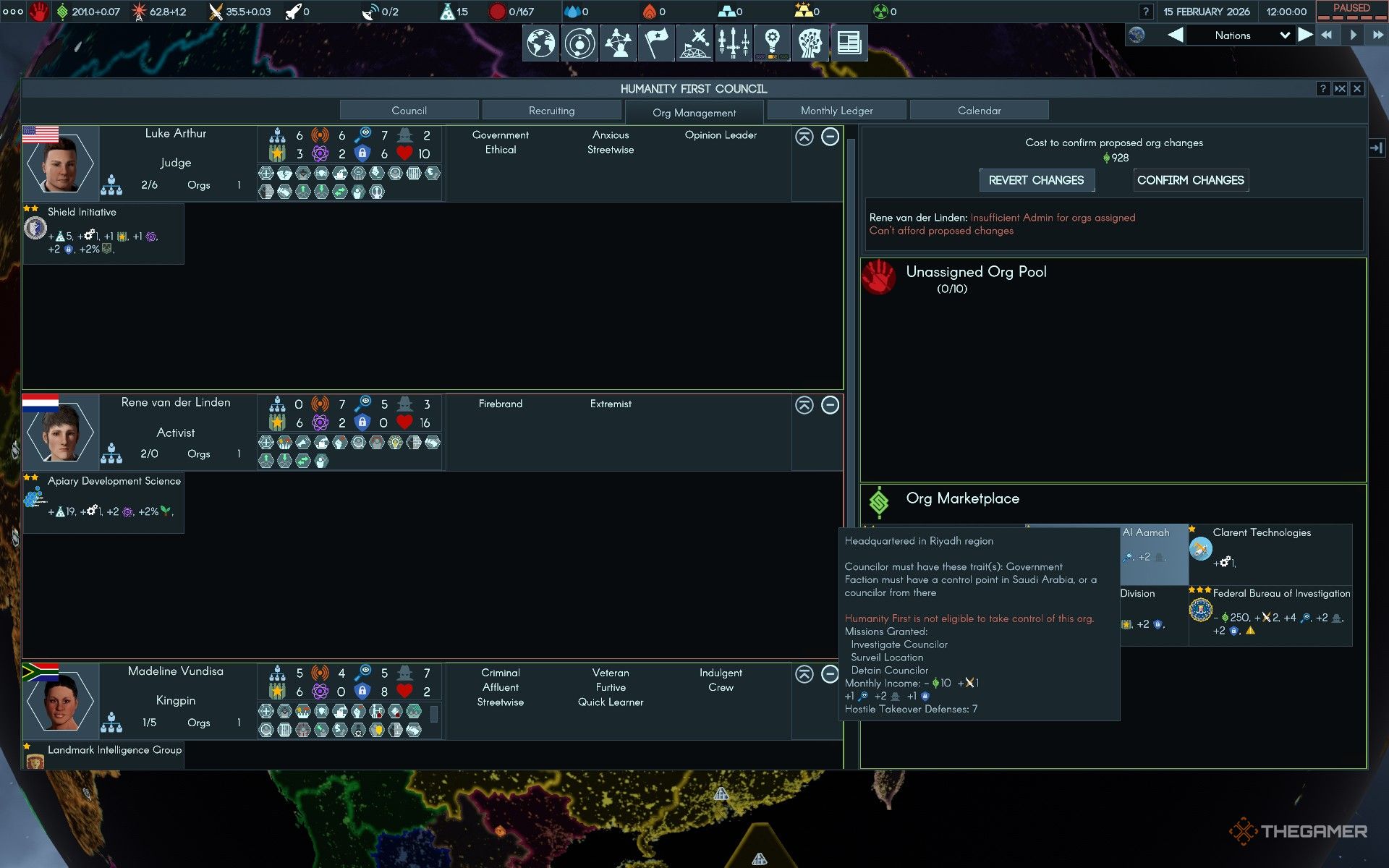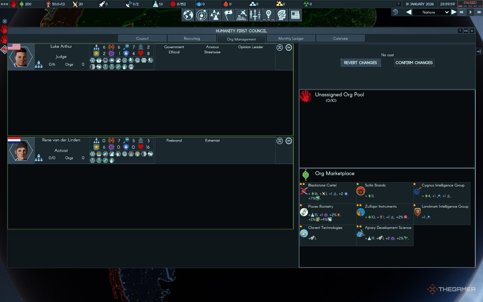 В меню Совета вы можете инвестировать в новые организации для ваших советников. Ищите вкладку ‘Org Management’ – к ней можно получить доступ, нажав на сеть иконок людей, которые являются третьей группой слева на панели в центре вашего экрана. Здесь вы найдете список ваших текущих организаций и опции для покупки новых.