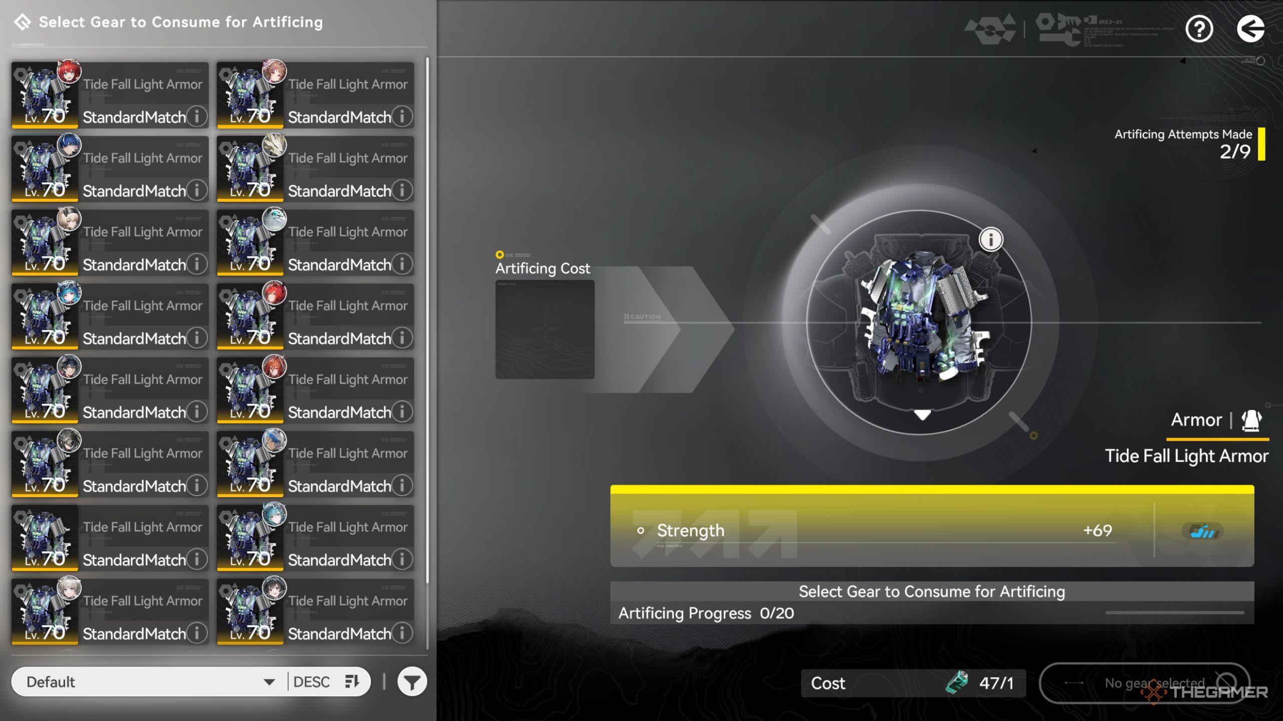 После создания предмета экипировки вы можете улучшить его до девяти раз, используя три различных способа улучшения каждой характеристики. Вы улучшаете экипировку через вкладку Artificing при её сборке. Чтобы улучшить характеристику, вам нужно пожертвовать другой предмет экипировки той же редкости, который соответствует определенным критериям.