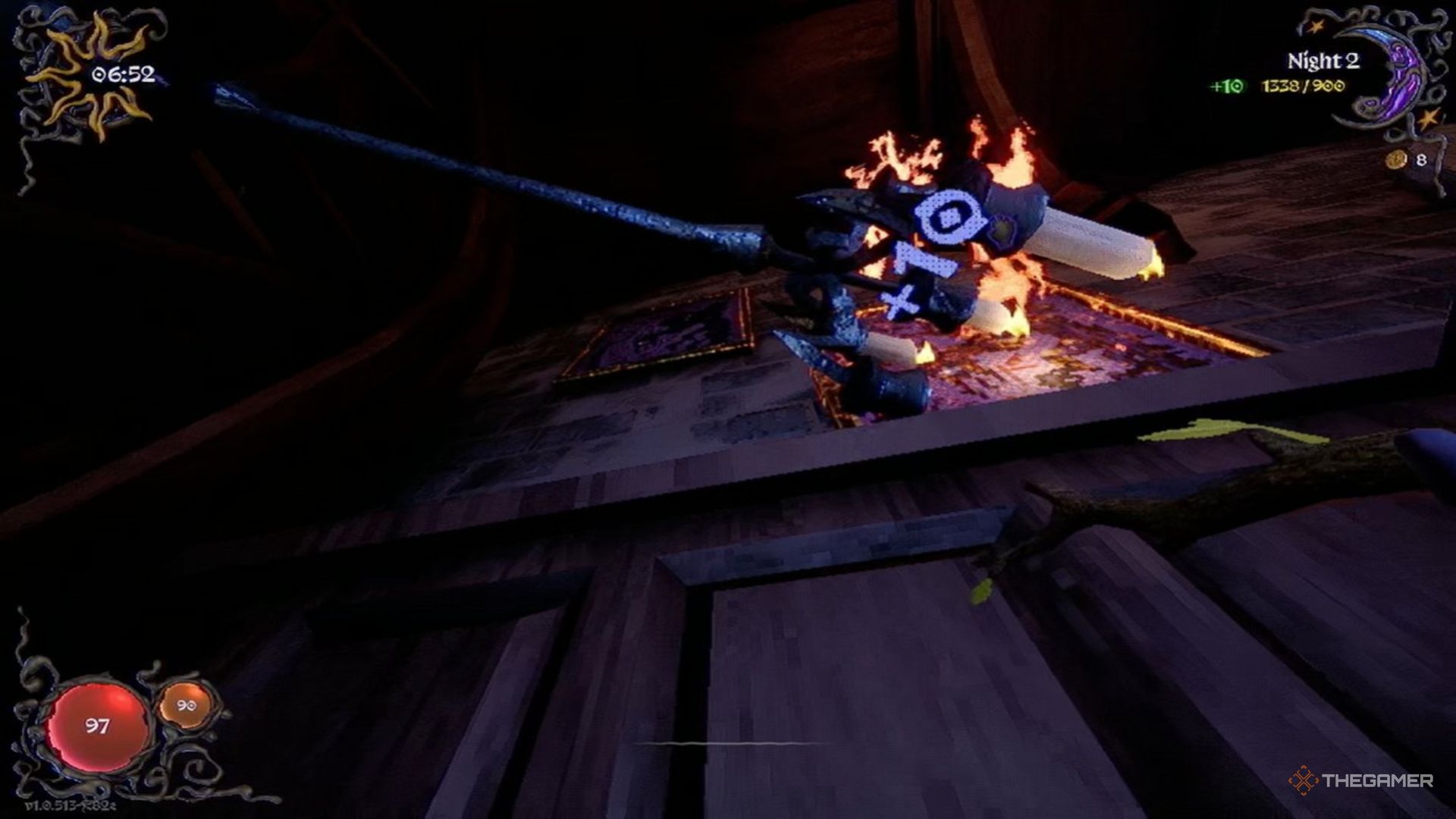 Когда вы начнете ваше трехдневное пребывание, вы увидите квоту, отображаемую в правом верхнем углу экрана. Как только вы выполните эту квоту, вы можете выбрать завершение пребывания и переход к следующему этапу, или рискнуть продолжить оставшиеся ночи. Объем разрушений, которые вы нанесли замку, определяет вашу квоту, и выполнение ваших контрактных целей может помочь вам быстрее ее достичь.