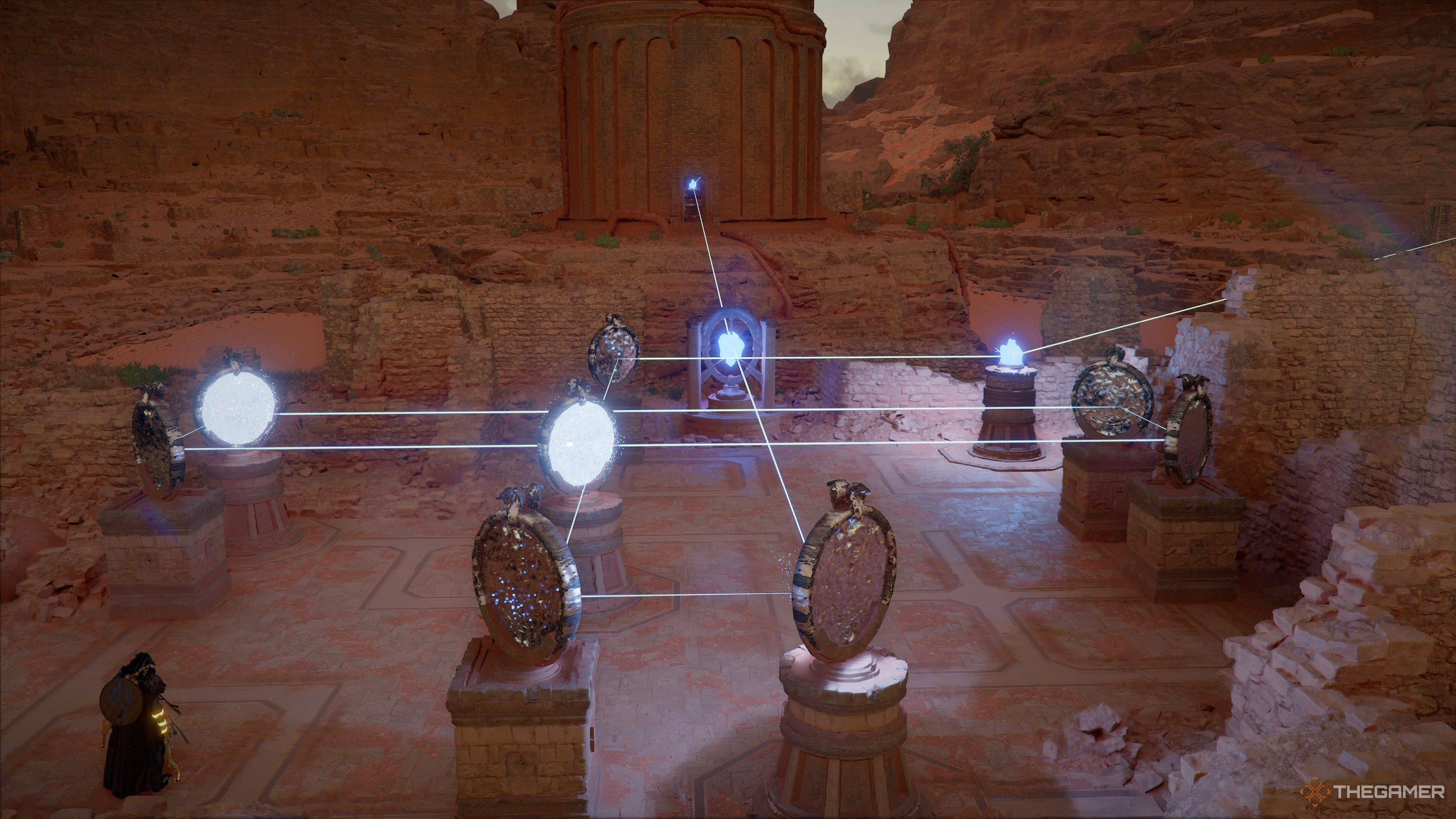 Когда вы достигнете башни, вы обнаружите, что все двери заперты. Чтобы продолжить, направляйтесь на восток от башни – вы увидите группу зеркал, отражающих белый лазерный луч. Ваша задача – настроить зеркала так, чтобы лазерный луч проходил через кристалл, а затем попадал на другой набор зеркал, расположенных к югу от башни.