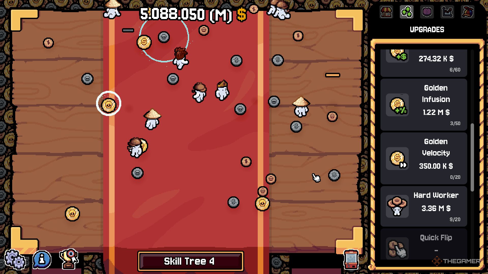 | Одинокий волк | Заработайте $1,000,000,000 без покупки помощника. | Без помощников вам придётся переворачивать все монеты самостоятельно. Заработать таким образом 1 миллиард долларов, естественно, очень трудоёмко. Вам определённо следует приобрести улучшения, которые позволяют переворачивать монеты, не нажимая на них. С ними вы сможете водить курсором по игровому полю, чтобы быстро переворачивать множество монет. |
