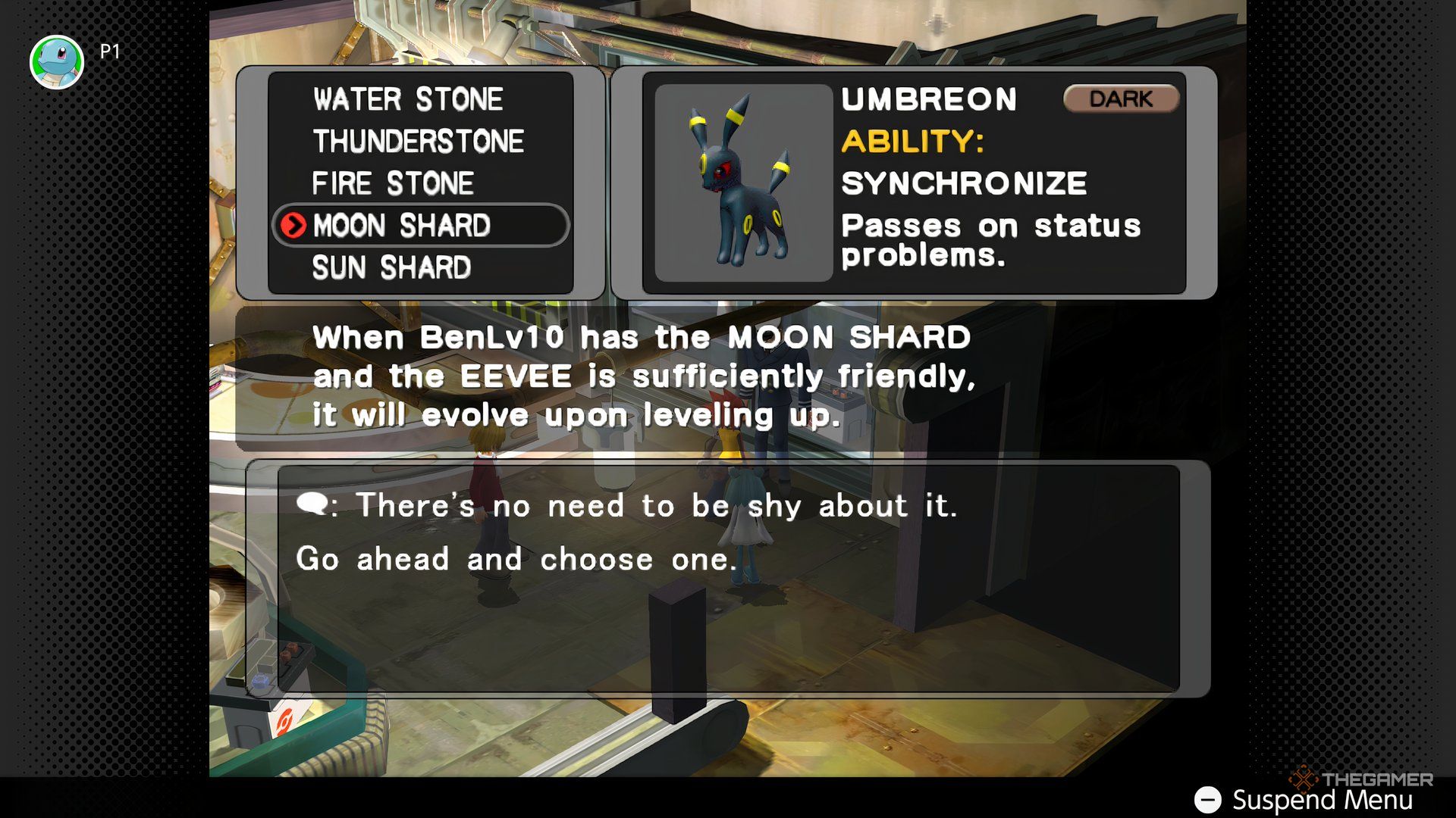 Как и Эспеон, Умбреон эволюционирует уникальным способом в этой игре. В отличие от основных игр Pokémon, где он эволюционирует ночью, в Pokémon XD нет эволюции, основанной на времени. Вместо этого вы используете Лунный осколок, чтобы его эволюционировать.