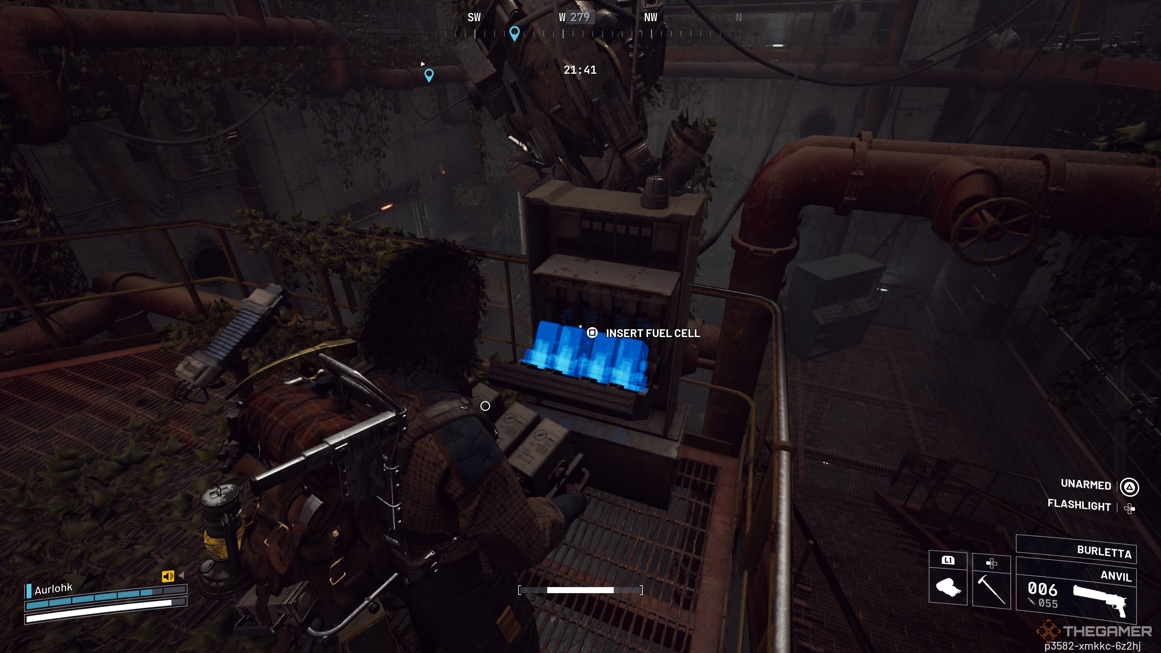 Спуститесь по лестнице на нижний уровень и найдите Топливный элемент рядом с Оболочкой Осы, недалеко от одной из дверей. Возьмите Топливный элемент и отнесите его обратно наверх по лестнице к коричневому генератору на галерее, которая находится на третьем уровне.