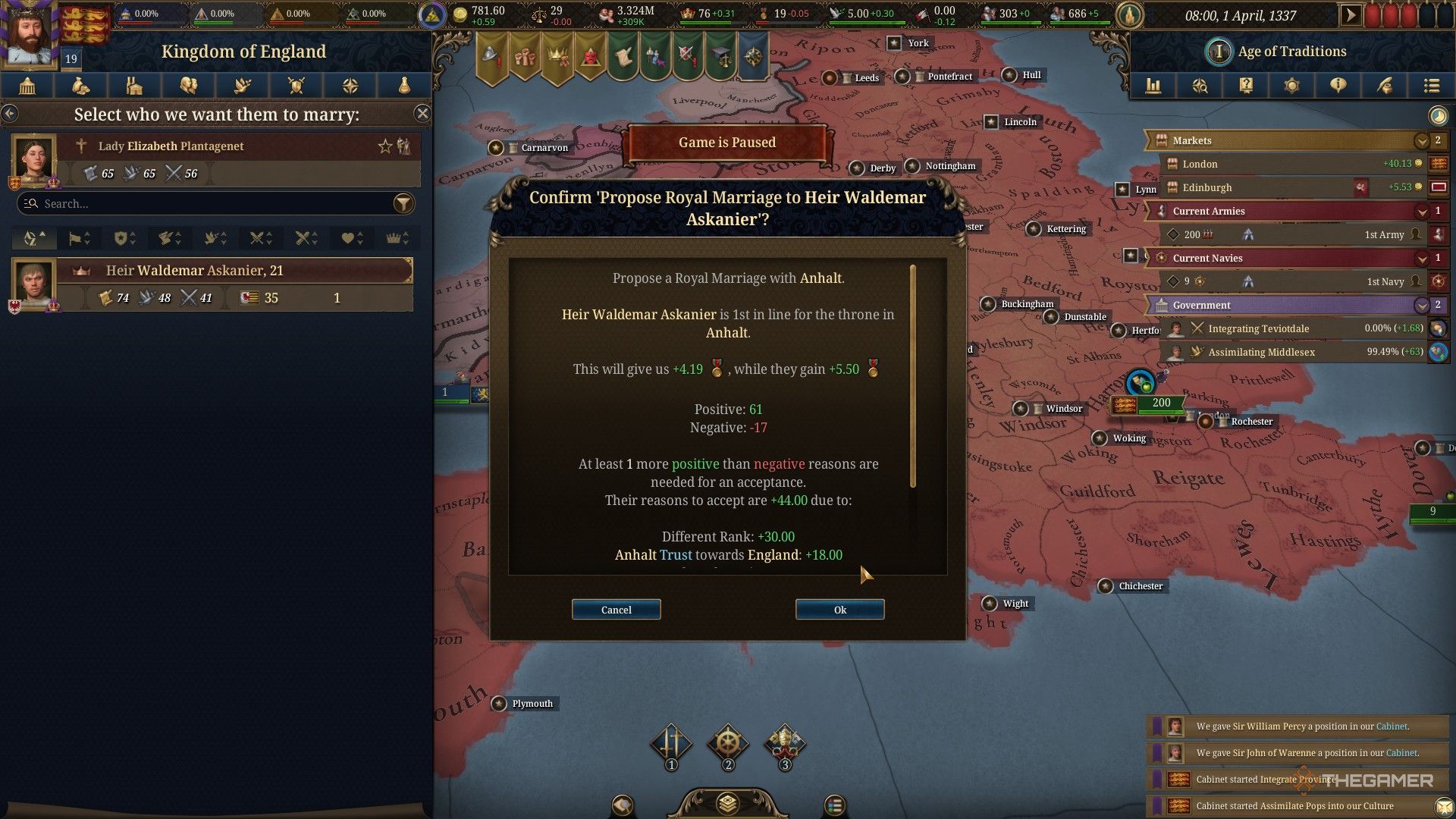 - Принятие или организация Королевского Брака со уважаемой страной, чей показатель Престижа достаточно высок, чтобы он прибавился к вашему после завершения союза. Вы оба будете влиять на показатели Престижа друг друга посредством брака, и вы увидите, насколько именно, прежде чем принять решение.