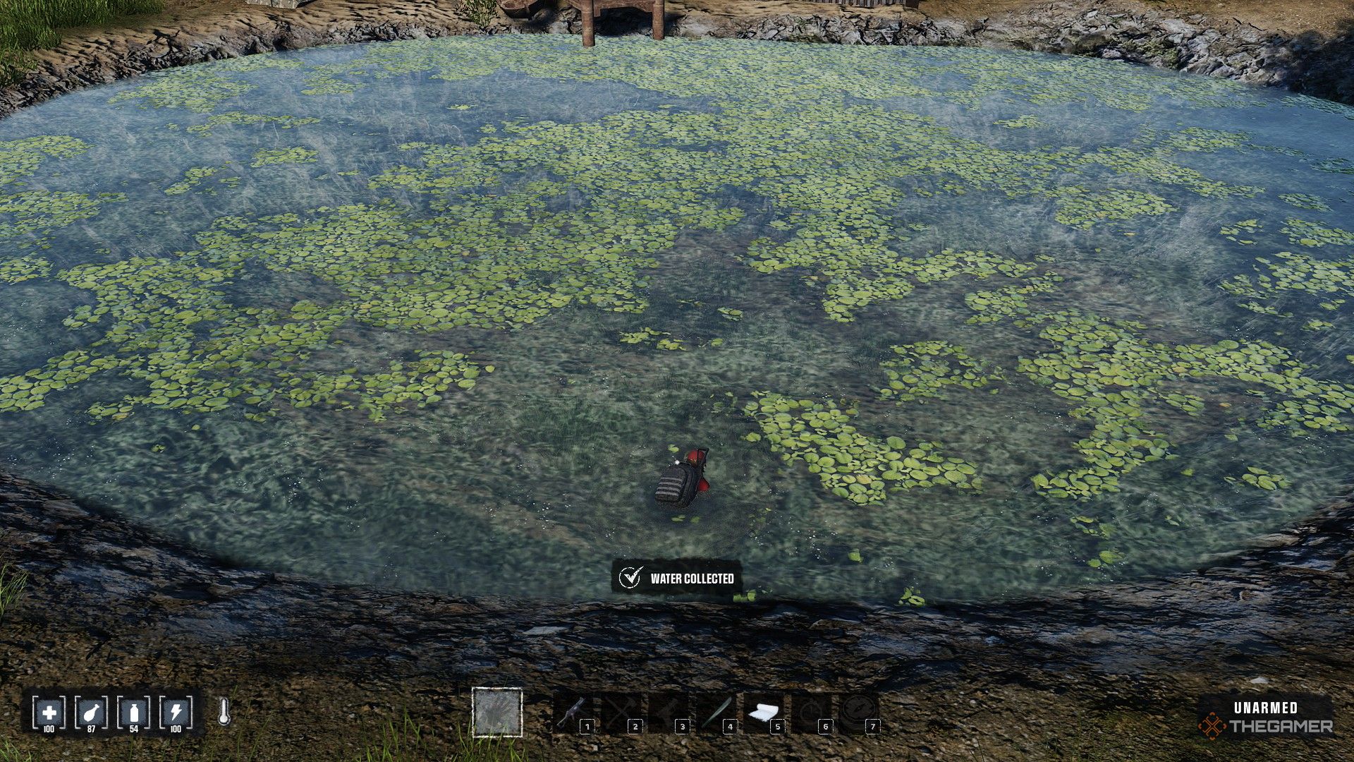 Как игрок, я нашёл несколько способов получить воду! Вы можете строить Водосборники, или, если у вас есть пустая бутылка, вы можете удерживать клавишу ‘F’, находясь рядом с прудом – хотя это даст вам Грязную воду. Вы также можете просто найти бутылки, в которых уже есть чистая вода, что очень удобно!
