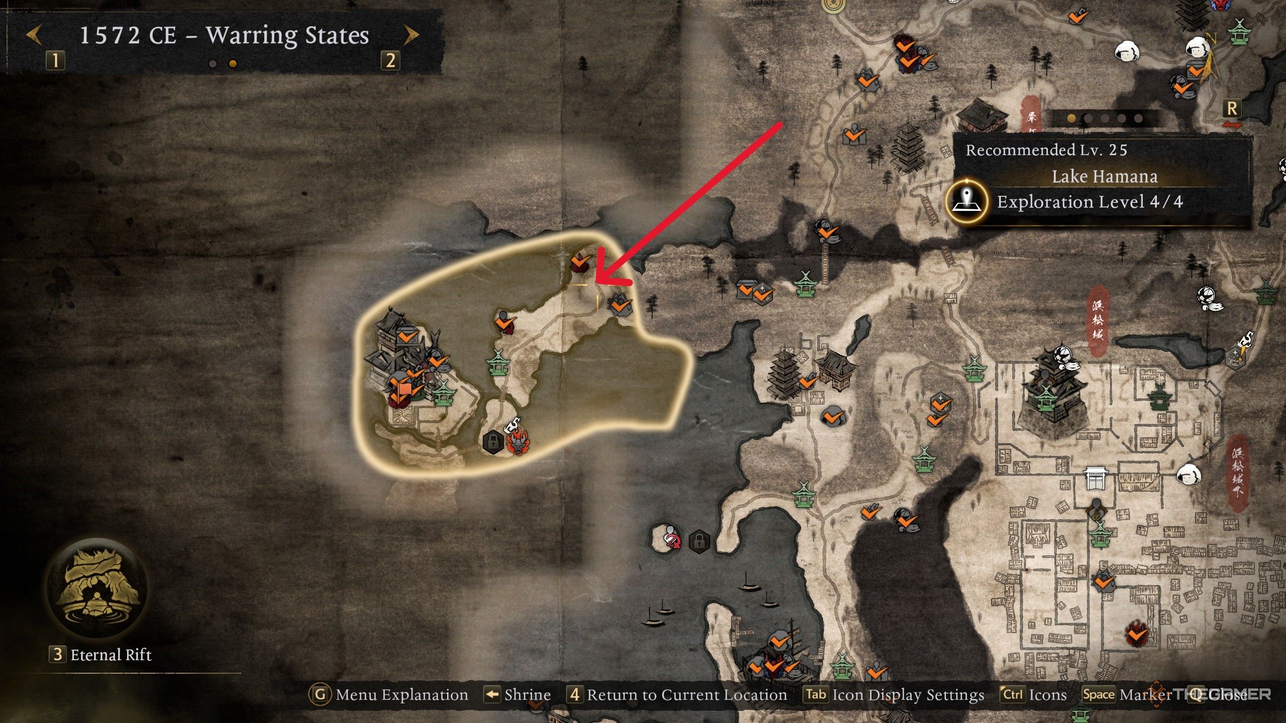 Окей, так что если вы хотите сразиться с Тайгеном Сессаем, есть одна вещь, которую вы абсолютно должны сделать сначала: побочное задание «Беда на озере Хамана». Я только что узнал о нем, и вы начинаете его, направившись к озеру Хамана – оно находится на западной стороне карты, и до него немного быстрее добраться именно так. Когда вы прибудете, ваш Дух-Хранитель расскажет вам об этом огромном ёкае, Дайдара Боччи, который причиняет неприятности, и, по сути, вам предстоит успокоить его!