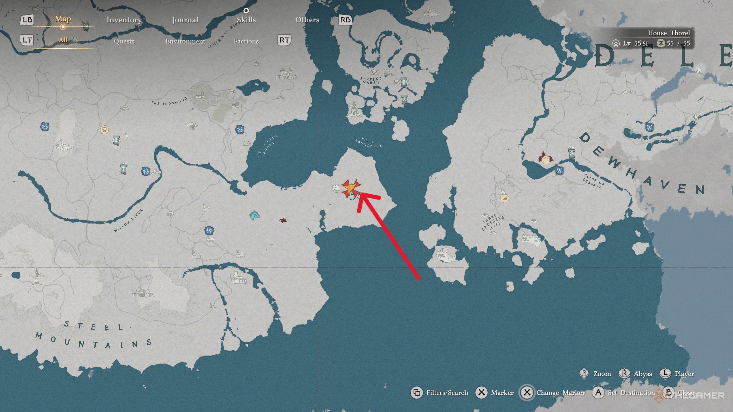 Вместо телепортации на новый остров, вы прибудете в Bowsprit Cape. Вы также можете найти его, направившись на юг от Demeniss – он расположен на полуострове возле Bay of Abundance. Ищите большой, сломанный лифт, лежащий на земле под наклоном.