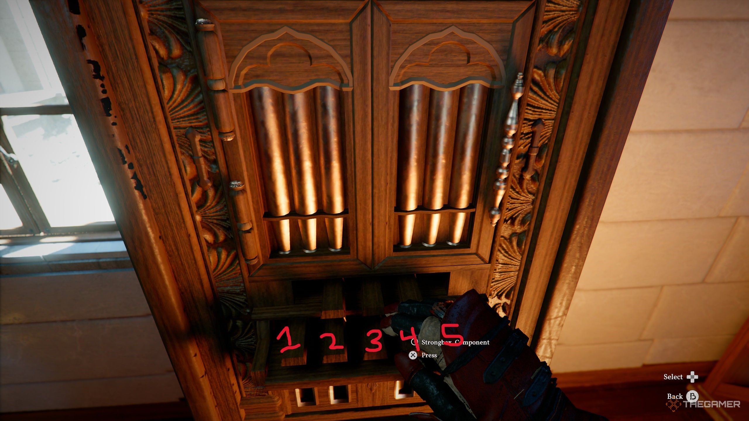 Поднявшись через окно второго этажа, найдите столовую – она прямо напротив главной лестницы. Оказавшись внутри, посмотрите налево на стену, где вы увидите сейф. Чтобы открыть его, подойдите к сейфу и поверните шестерню сбоку – это запустит музыкальную головоломку.