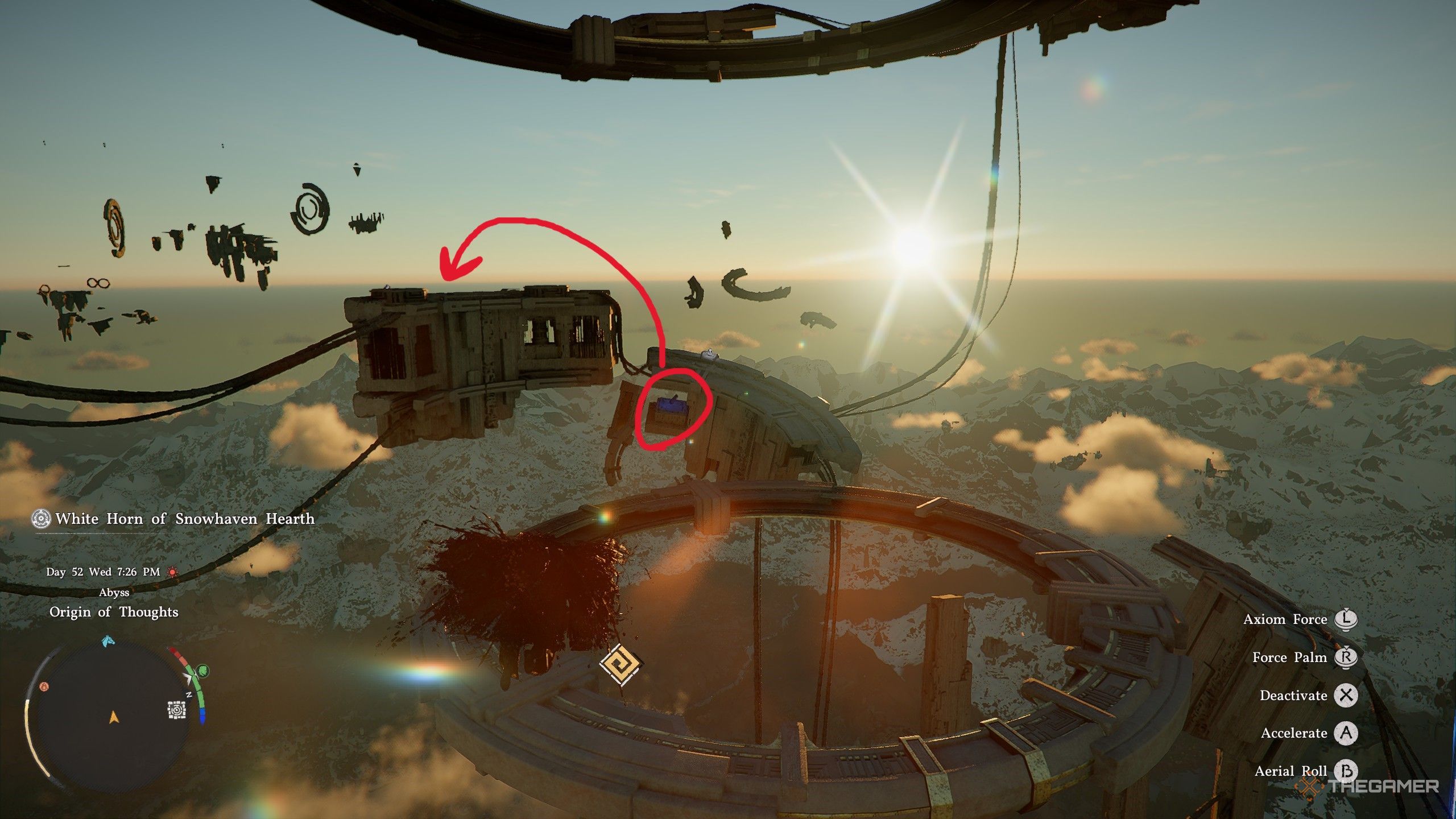 Когда вы выровняете три вращающихся круга с фиксированными точками в верхнем левом углу, они засветятся синим, и камера автоматически изменит перспективу. Затем прыгните сквозь светящееся кольцо и упадите на самый нижний уровень Origin of Thoughts. Внизу вы увидите небольшой, светящийся круглый переключатель. Присядьте и нажмите кнопку R3, чтобы активировать его с помощью Force Palm.