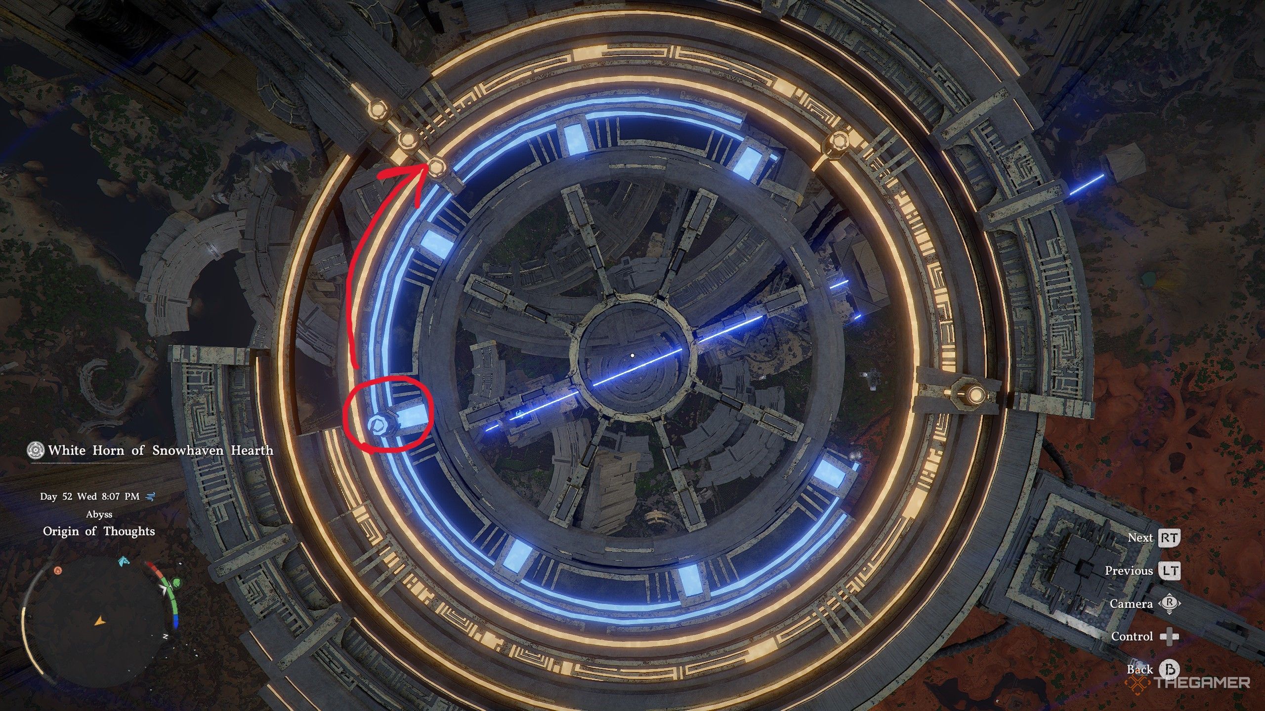 Когда вы выровняете три вращающихся круга с фиксированными точками в верхнем левом углу, они засветятся синим, и камера автоматически изменит перспективу. Затем прыгните сквозь светящееся кольцо и упадите на самый нижний уровень Origin of Thoughts. Внизу вы увидите небольшой, светящийся круглый переключатель. Присядьте и нажмите кнопку R3, чтобы активировать его с помощью Force Palm.