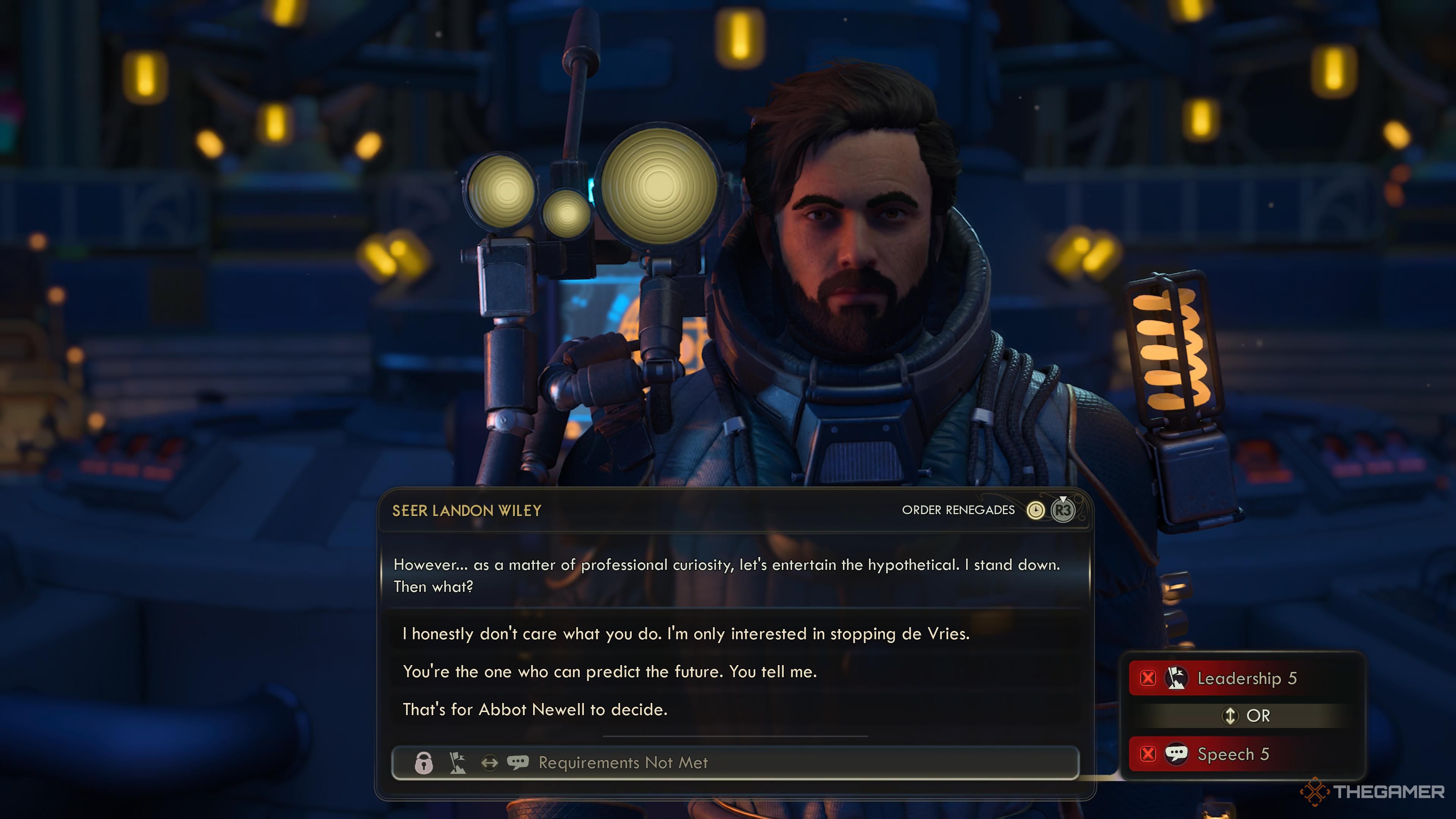 Наконец, вы сталкиваетесь с Уайли. Он отреагирует в зависимости от того, спасли ли вы заложников, объясняя, что он намеревался сделать: передать полный контроль над безопасностью на станции Greater Tranquility Station де Врису. На этой станции Order и Auntie’s Choice запланировали провести мирные переговоры.