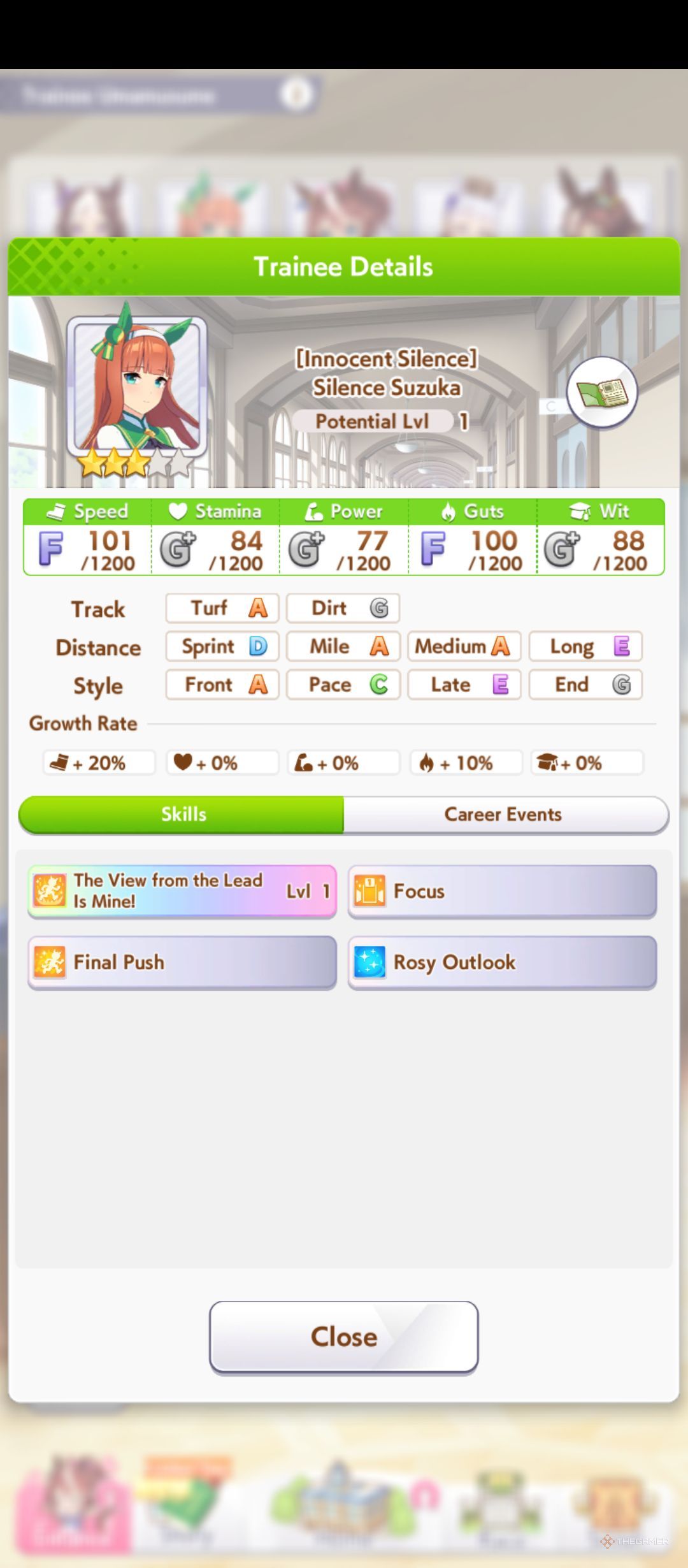 Развитие Сайленс Судзуки относительно просто в Umamusume: Pretty Derby. Хотя скорость — её основной фокус, небольшое повышение других характеристик поможет ей её поддерживать. Она отличный лидер и может быстро набрать много скорости во время гонок.