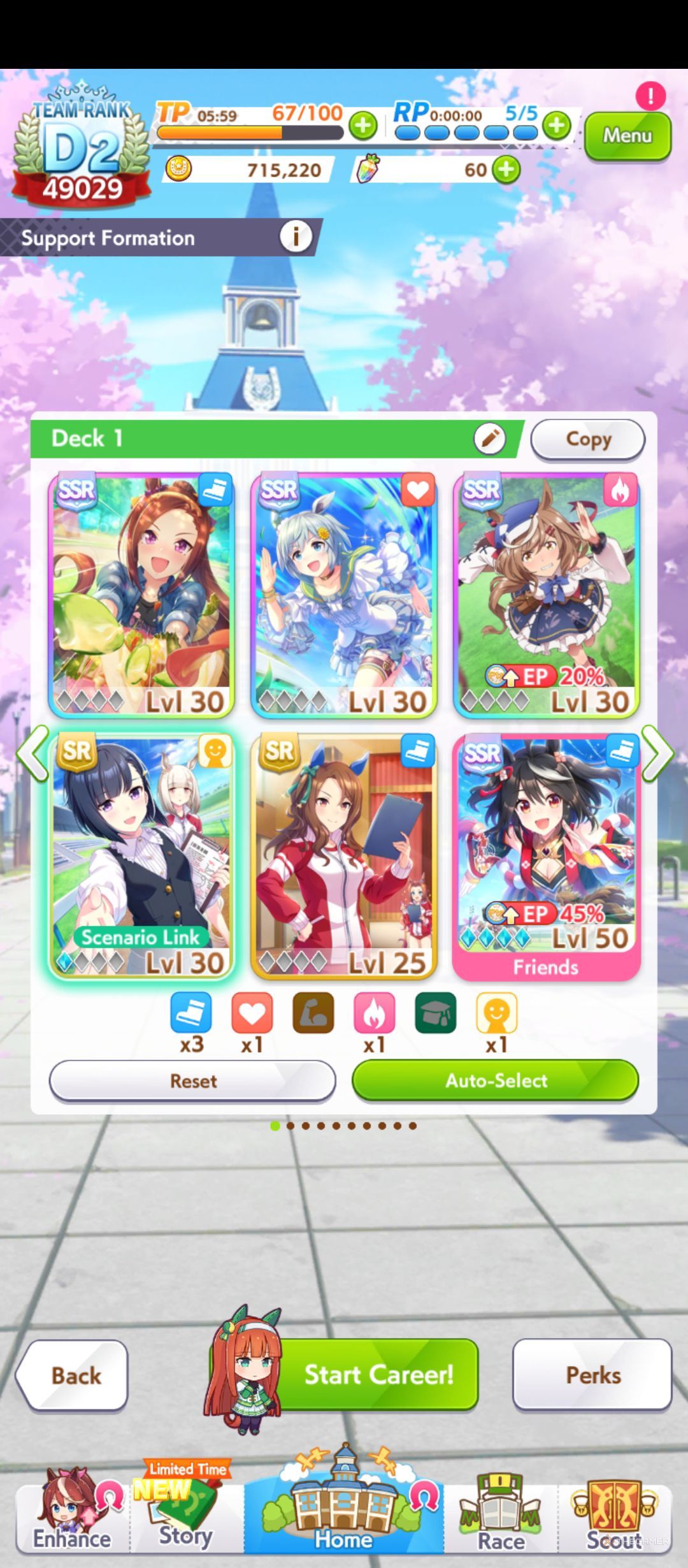 | После гонки | Победа (G1) | Верх: -25 Энергии, +4 к случайной характеристике, +25 Очков умений