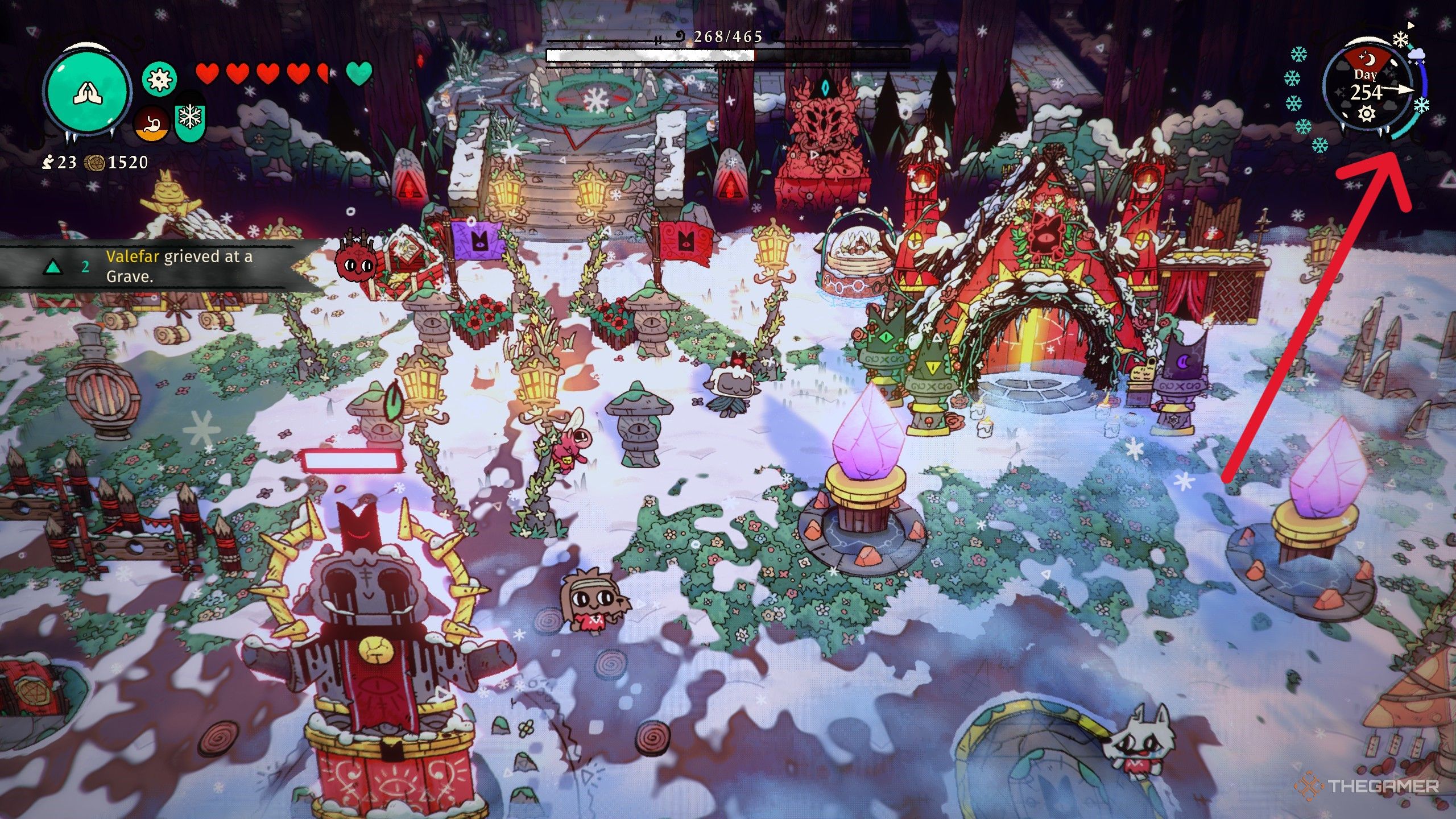 Вы можете отслеживать прогресс Ингьи в повышении уровня, глядя на ярко-голубую полосу у основания статуи в Woolhaven. Когда полоса почти заполнится, будьте готовы к зиме – либо уже находитесь в ней, либо убедитесь, что у вас достаточно припасов. Вы не хотите, чтобы буран обрушился, прежде чем вы соберете достаточно еды и Rotburn, чтобы хватило на холодные дни.