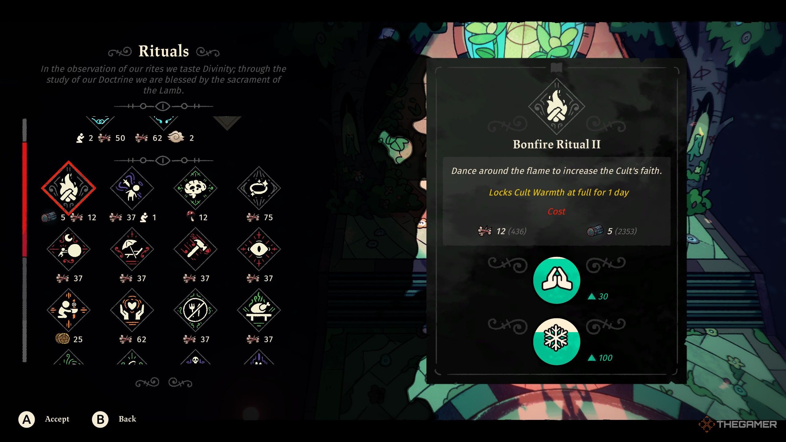 К счастью, есть способы защитить ваших последователей от холода, помимо простого использования Печи. Ритуал Костра II – отличный вариант – он поддерживает тепло всех на текущем уровне в течение целого дня! Он особенно полезен перед исследованием подземелий или когда надвигается метель. Кроме того, он недорогой, стоит всего двенадцать костей и пять дерева, поэтому не стесняйтесь использовать его часто!