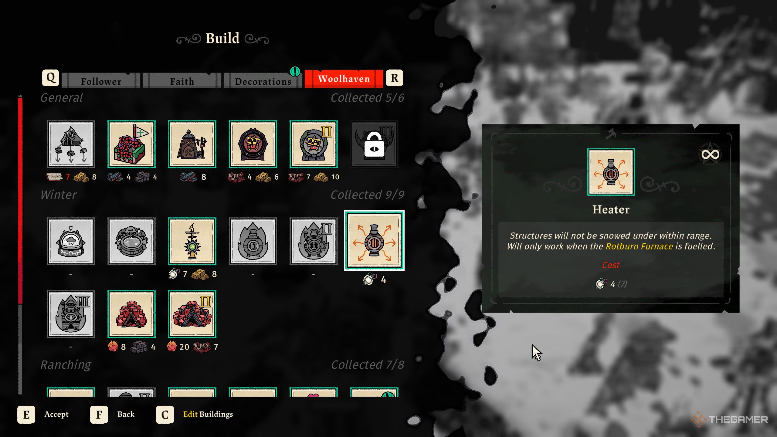 Легко упускать из виду свою печь каждый день, но важно поддерживать её полной перед тем, как отправиться в приключения или в подземелья. Без тепла ваши последователи быстро замерзнут, поэтому собирайте как можно больше Rotburn в начале игры. Rotburn — единственный доступный источник топлива на ранних этапах.