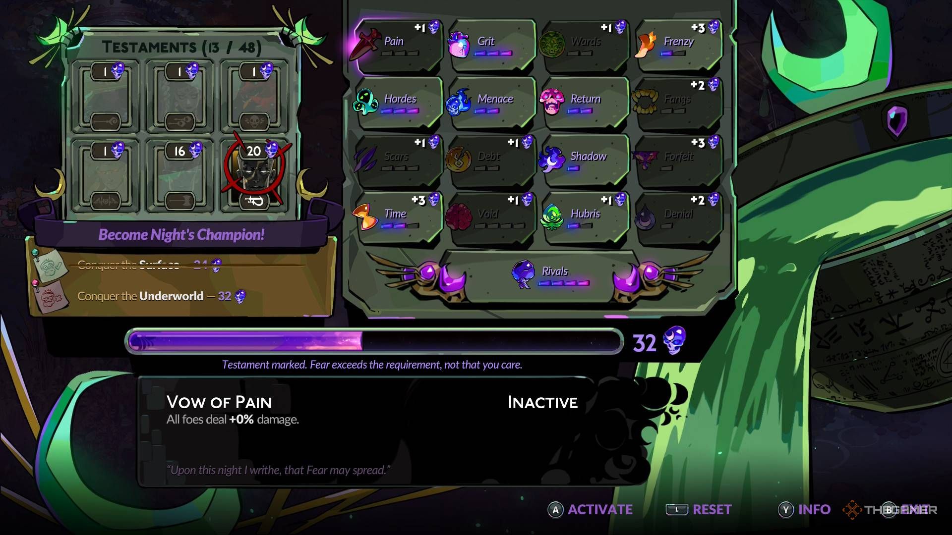 | Vow of Rivals | Это один из самых эффективных способов накопить значительное количество Страха, при этом внося минимальные изменения в вашу игру, так как это влияет только на бои с боссами. |