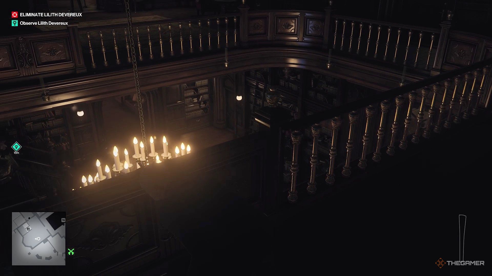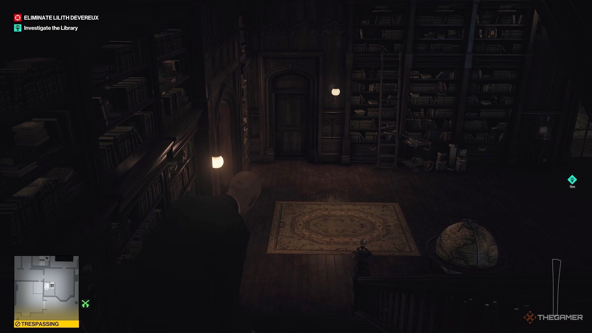 Она возвращается в библиотеку, а затем спускается на нижний уровень. Вам нужно остаться наверху и переместиться на другой конец, чтобы вы могли наблюдать за ней сверху.