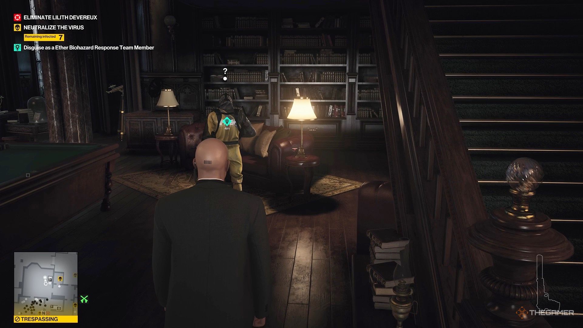 Сначала вам нужно получить маскировку отряда реагирования на биоопасность, прежде чем вы сможете продолжить. Для этого вернитесь в библиотеку и поищите человека в форме.