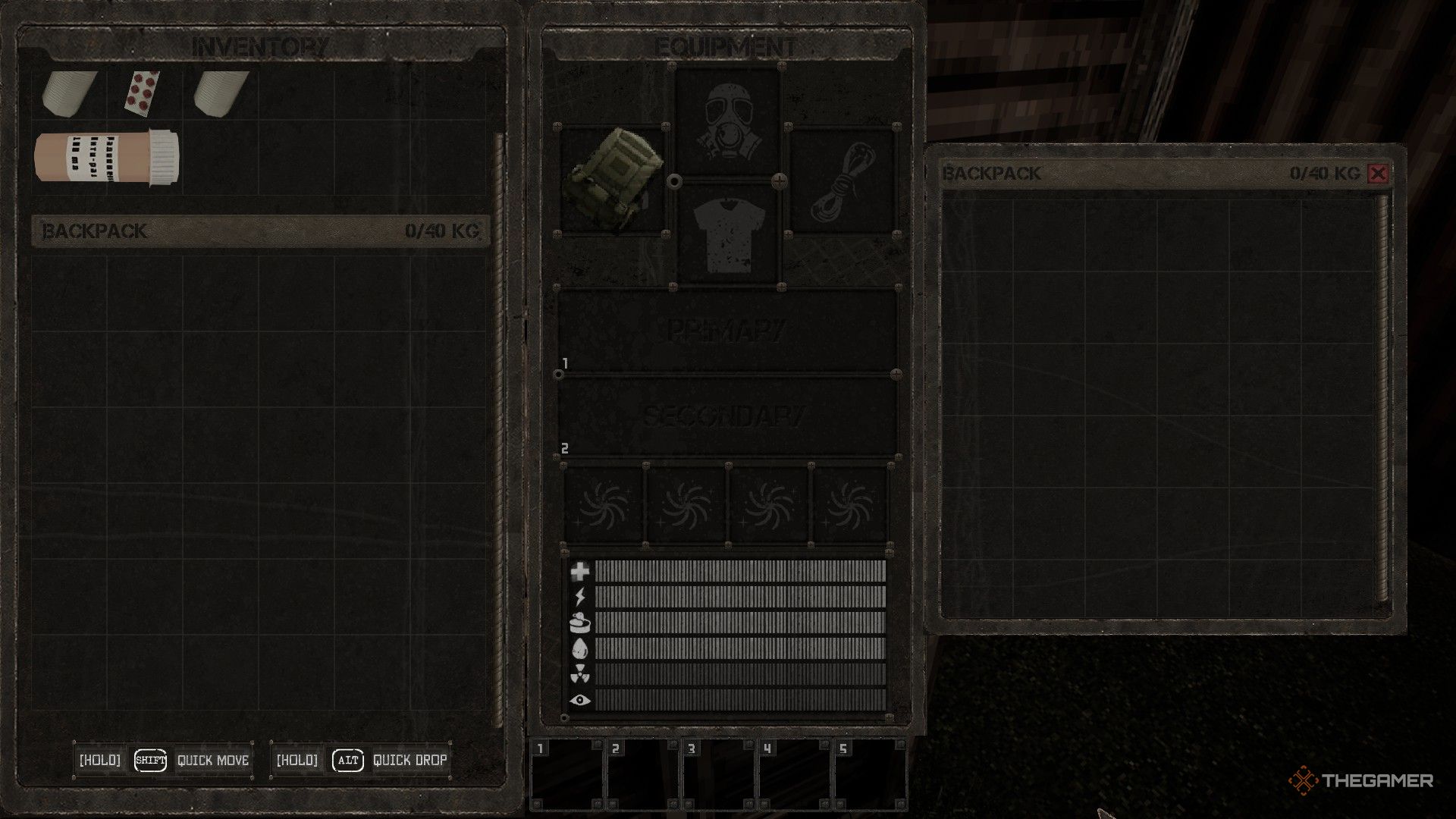 В Misery ваш инвентарь напрямую связан с тем, что вы носите в данный момент. Каждый предмет имеет вес и занимает определенное количество места. Например, ваш базовый инвентарь, такой как карманы, может вместить до 15 кг предметов и поместить вещи в девять ячеек. Вы можете заполнить все девять ячеек, оставаться в пределах лимита веса в 15 кг или найти баланс между этими двумя параметрами.