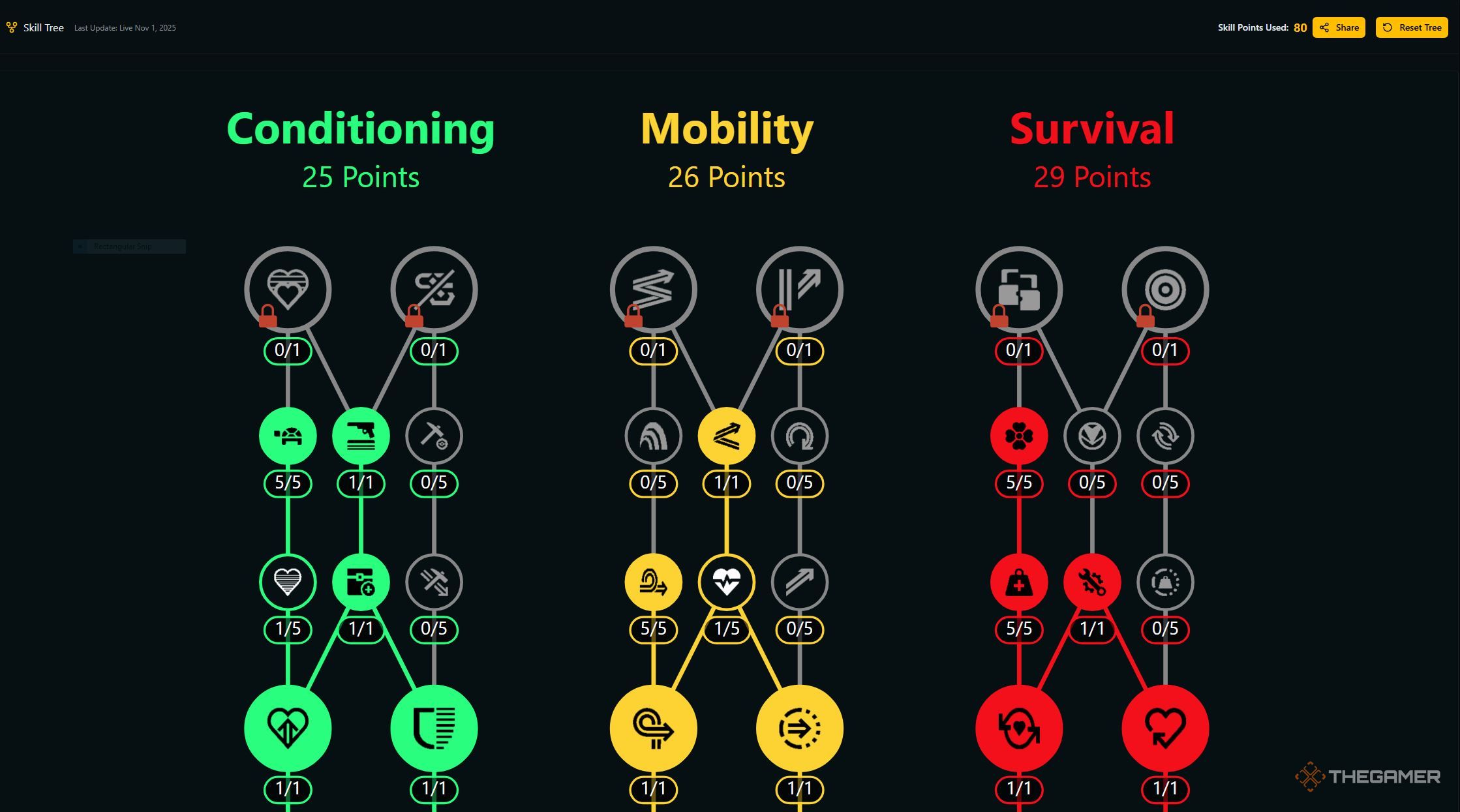 Окей, когда я создаю своего Рейдера, у меня есть 80 очков умений, с которыми можно поиграть. Большинство из них – 75, если быть точным – я получаю просто за повышение уровня. Но вот в чем крутая часть: сколько денег у меня осталось с моей последней Expedition, дает мне дополнительные 5 очков! Этот сайт потрясающий, потому что он позволяет мне тестировать разные сборки и точно видеть, сколько очков мне нужно, чтобы разблокировать желаемые перки.